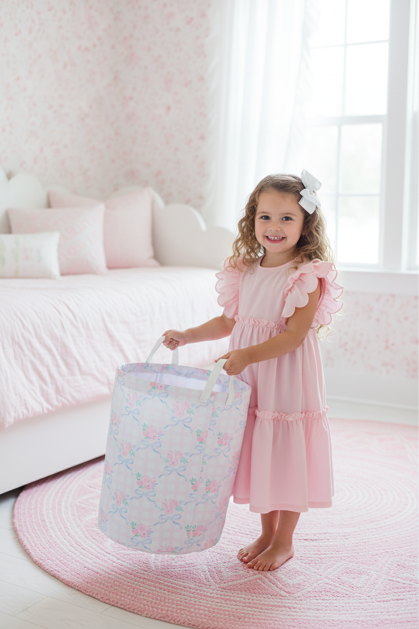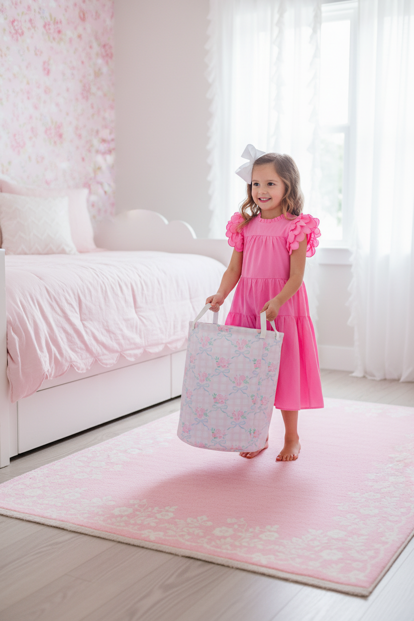 Two strong side handles make carrying effortless, while the foldable design tucks away neatly when not in use. Its versatile shape and darling pattern allow it to double as a storage bin for toys, books, or extra bedding, adding both color and organization to her space.