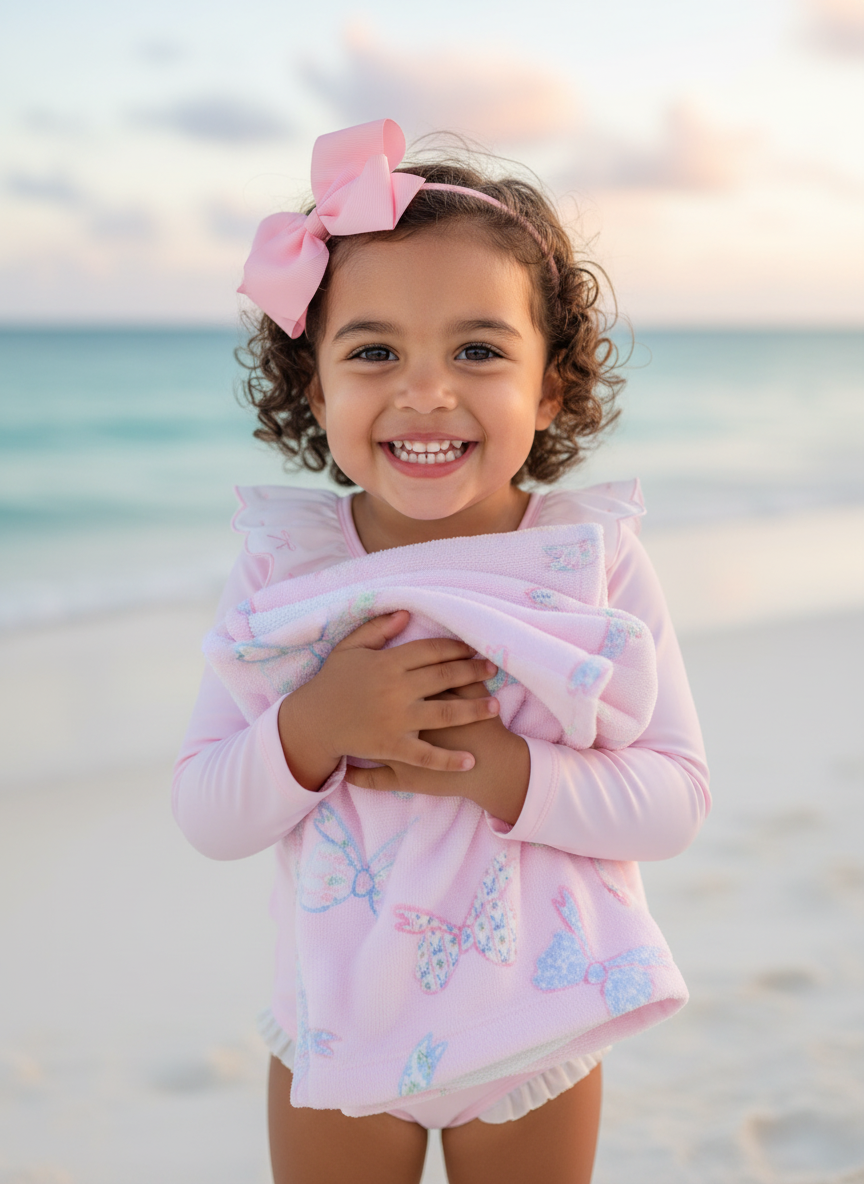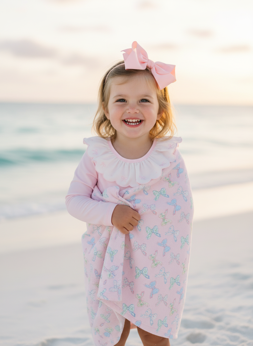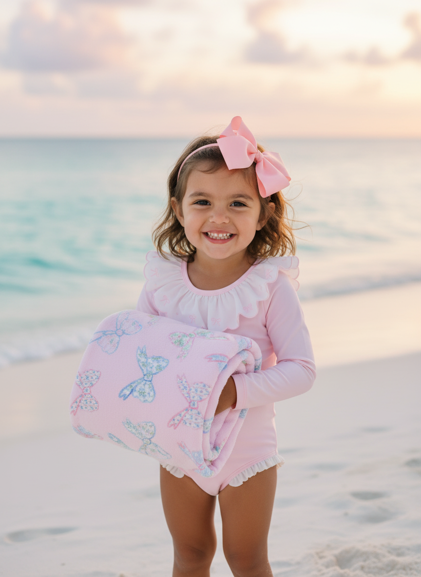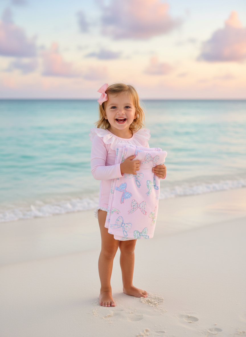 Floral Bow Beach Towel Wrap your little one in charm and comfort with this beautifully designed, generously sized towel. Perfect for beach days, pool time, or cozy bath moments, it features a soft polyester face showcasing our sweet floral bow print, paired with absorbent cotton terry loops on the reverse to gently wick away moisture.
