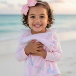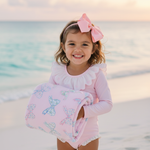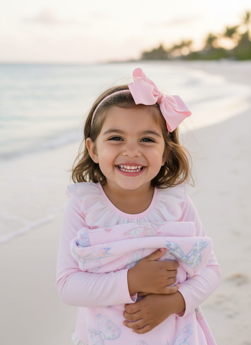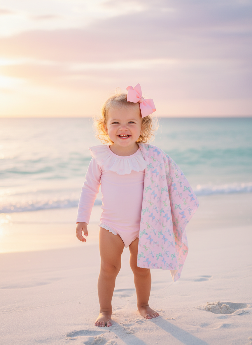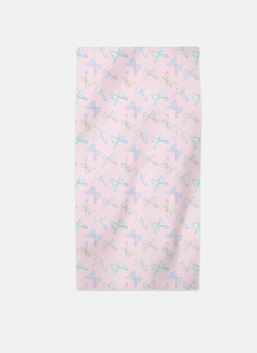 Floral Bow Beach Towel Wrap your little one in charm and comfort with this beautifully designed, generously sized towel. Perfect for beach days, pool time, or cozy bath moments, it features a soft polyester face showcasing our sweet floral bow print, paired with absorbent cotton terry loops on the reverse to gently wick away moisture.