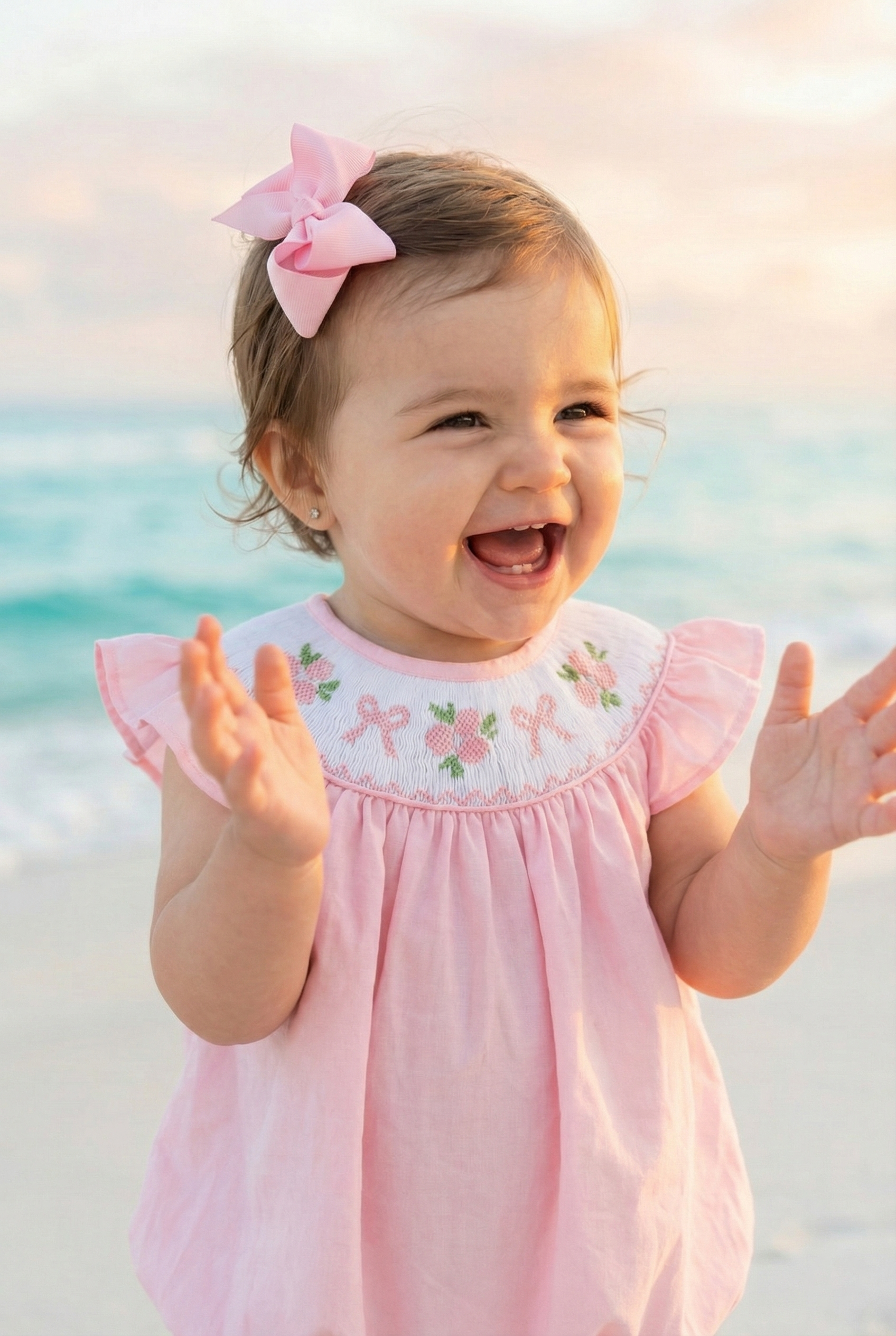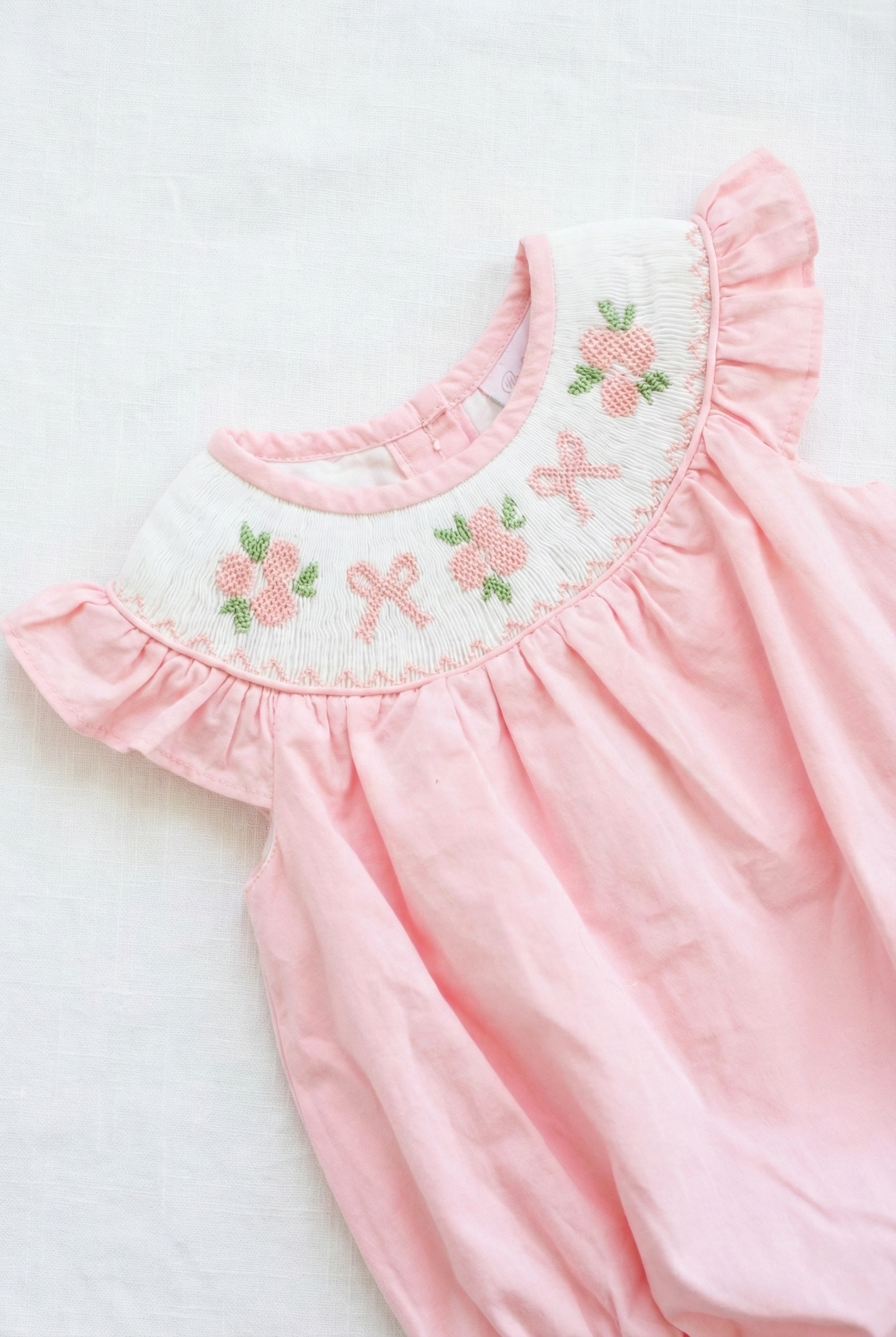 The gentle blush pink hue, flutter sleeves, and classic silhouette create an effortlessly elegant look—perfect for spring portraits, special occasions, church, birthdays, and cherished everyday moments. Each piece is thoughtfully hand smocked, making every bubble uniquely special.