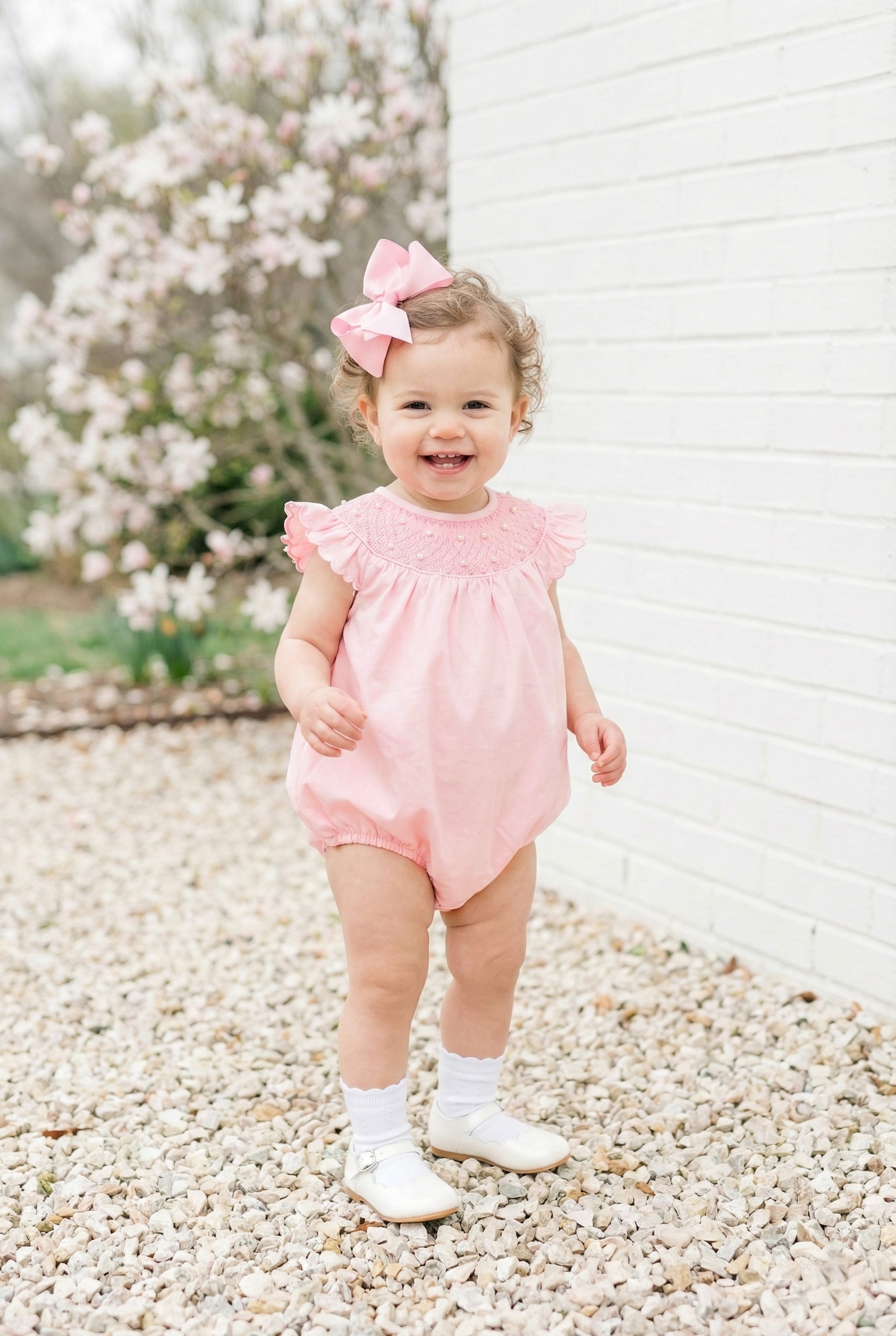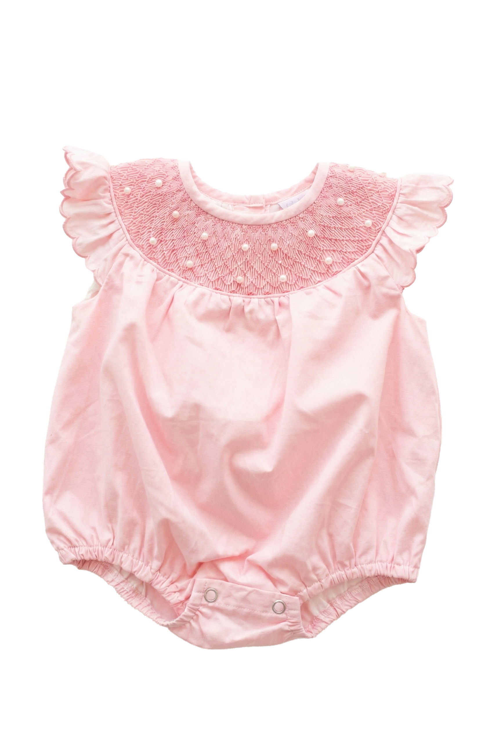 Soft, timeless, and full of Southern charm, the Blush Belle Pearl Bubble is a true heirloom treasure for your little girl. Crafted from 100% cotton and hand smocked with delicate pearl detailing, this sweet bubble is designed with the utmost care and attention to detail.