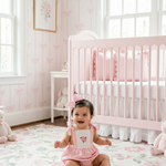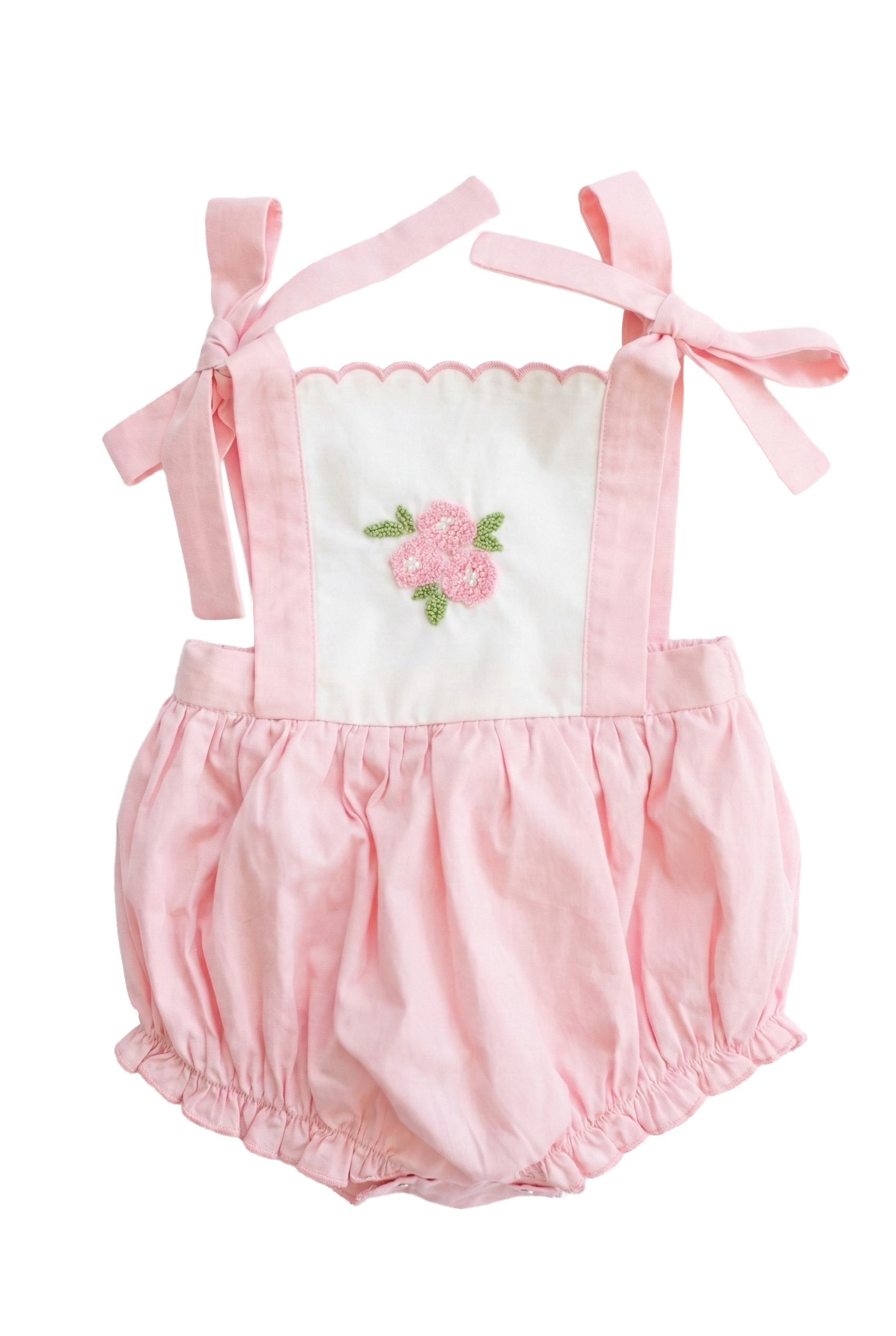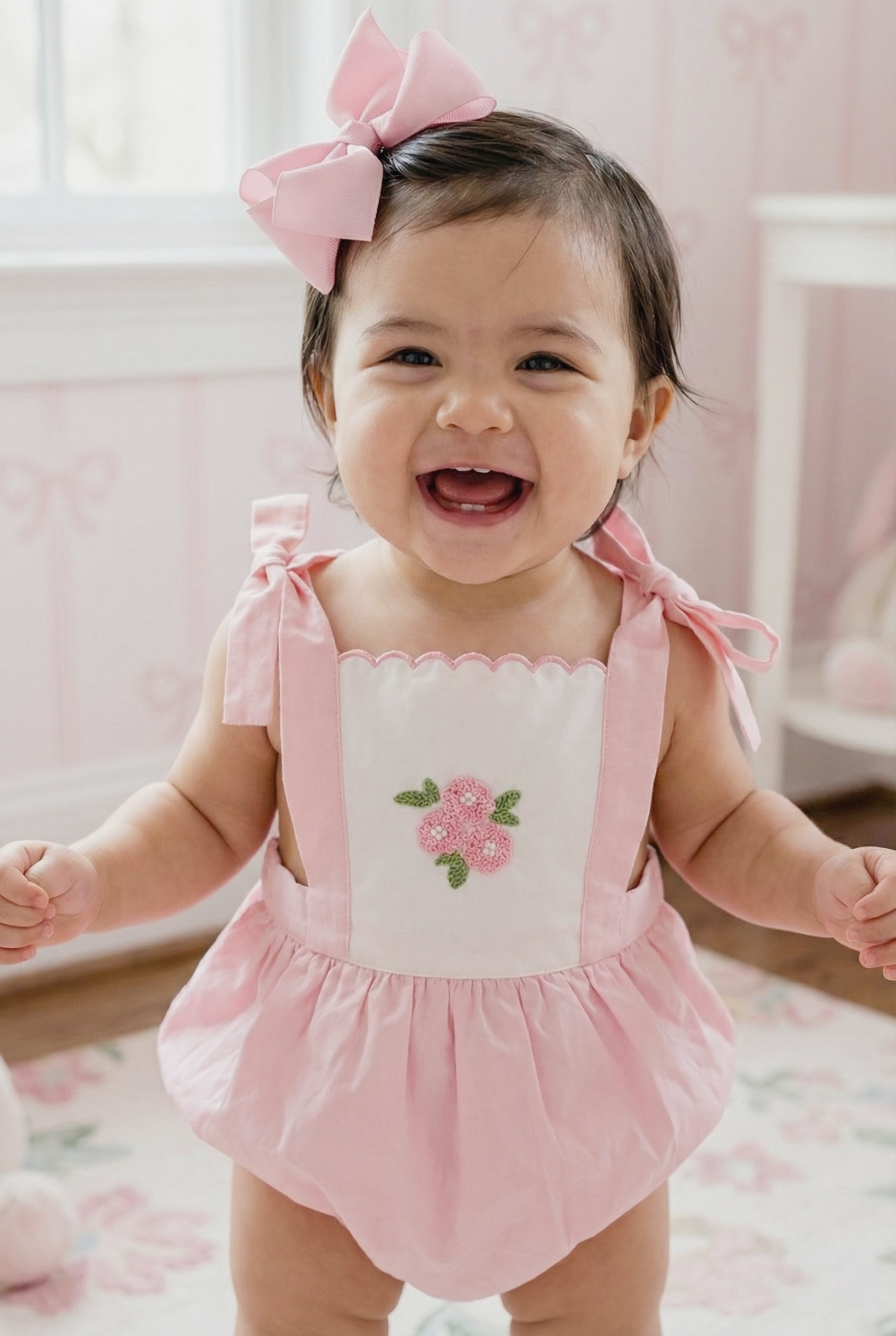 Soft, sweet, and timeless, the Pearly Pink Posy Tie Bubble is a true little heirloom treasure. Crafted from 100% cotton in the most delicate blush pink, this precious bubble features dainty tie-shoulder straps, a softly scalloped yoke, and the most charming hand-smocked detail.