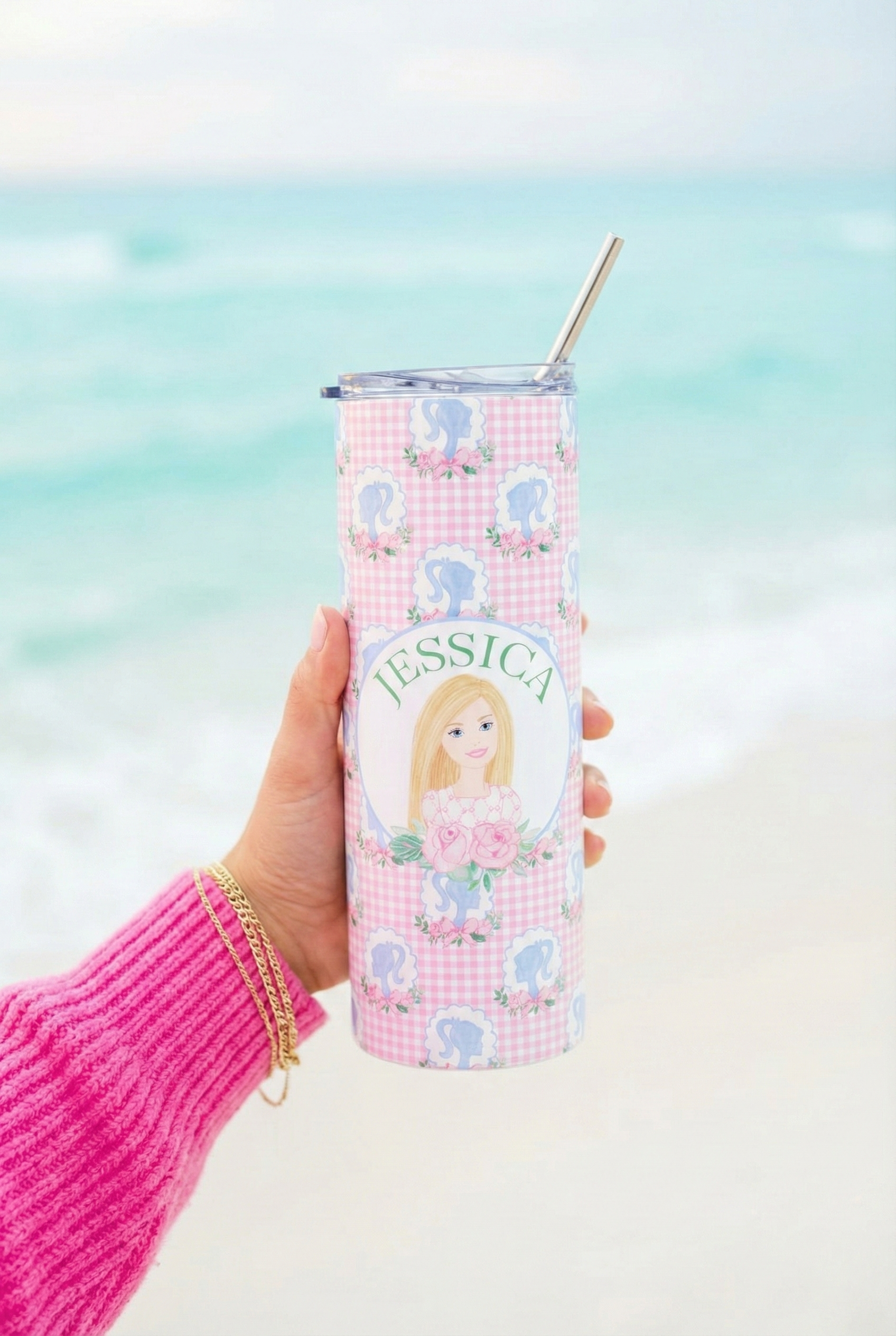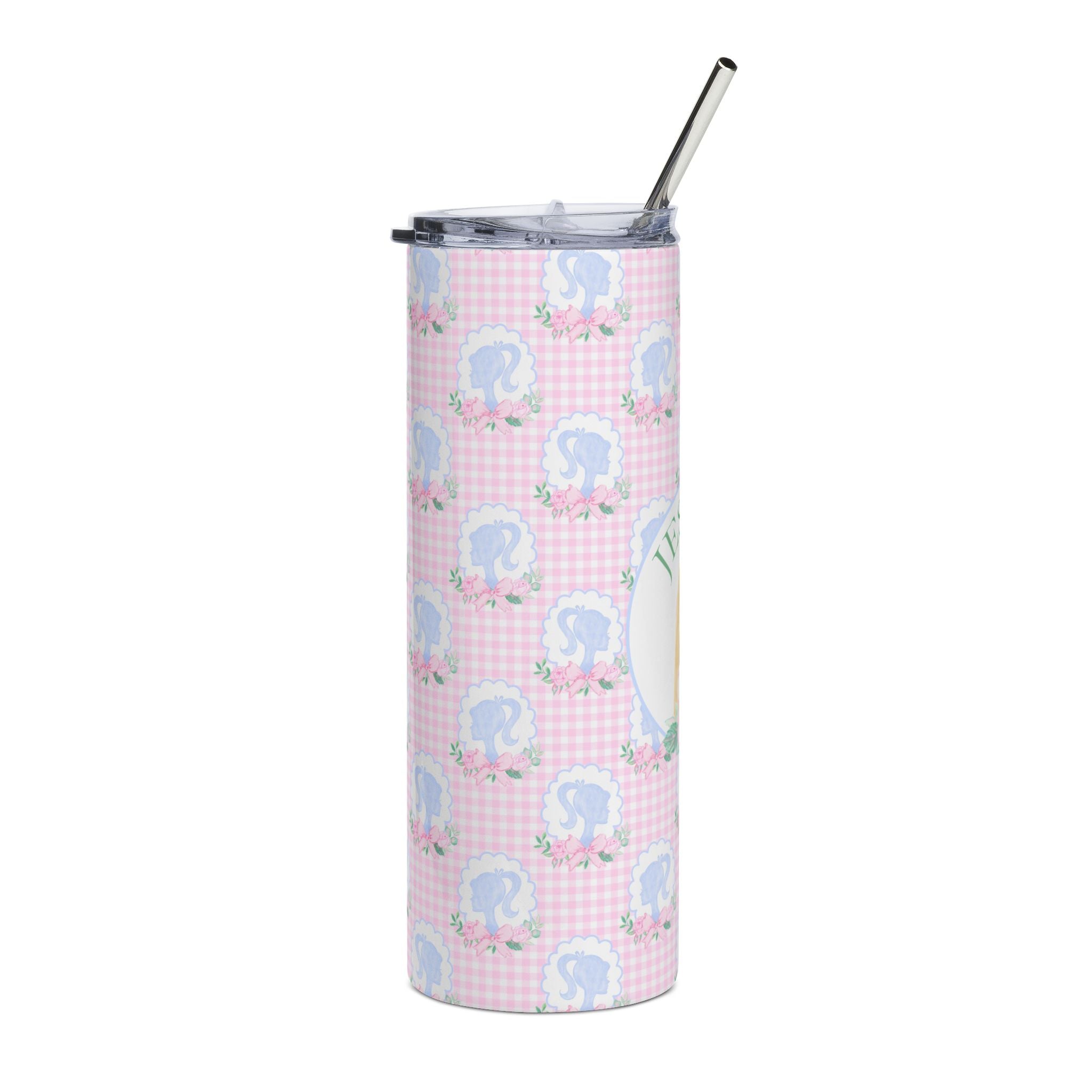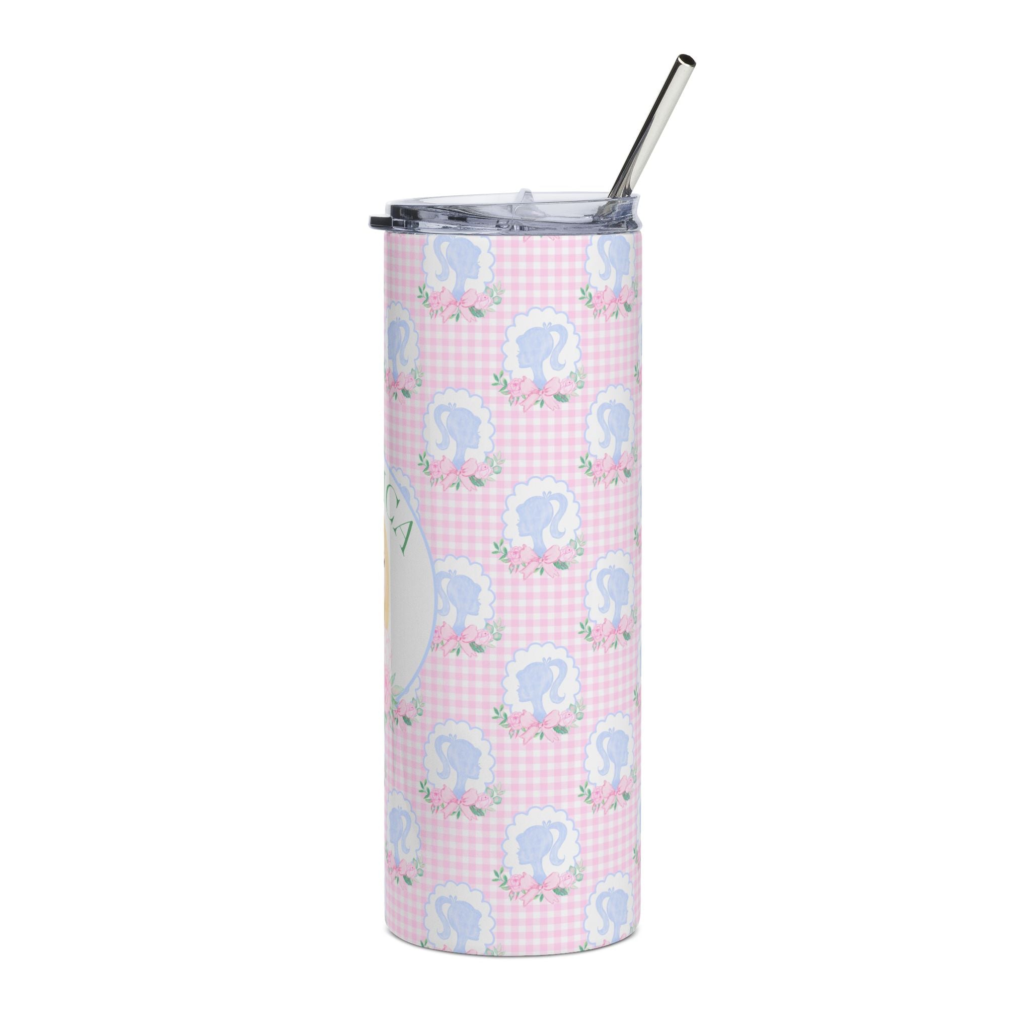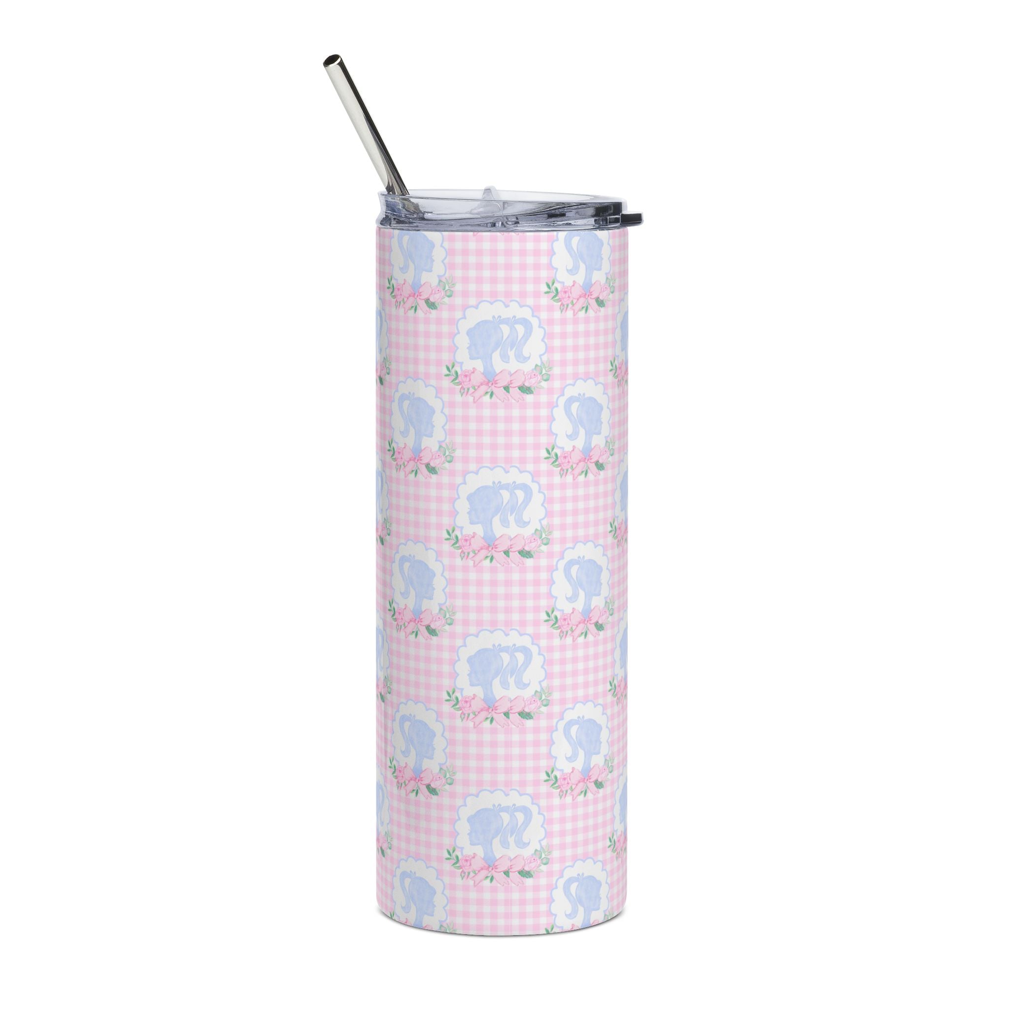 This slim 20 oz stainless steel tumbler brings a soft, whimsical touch to everyday routines. The glossy, protective finish showcases a delicate pink gingham pattern dotted with small cameo silhouettes and floral accents, while a personalized oval portrait adds a warm, nostalgic focal point. Lightweight and narrow, it slips easily into bags and cup holders — perfect for holding coffee on a brisk morning walk or staying hydrated between errands. The included clear lid and metal straw make sipping simple and feel slightly indulgent, while the durable stainless steel core resists rust so the tumbler stays fresh-looking through daily use.