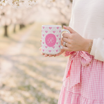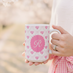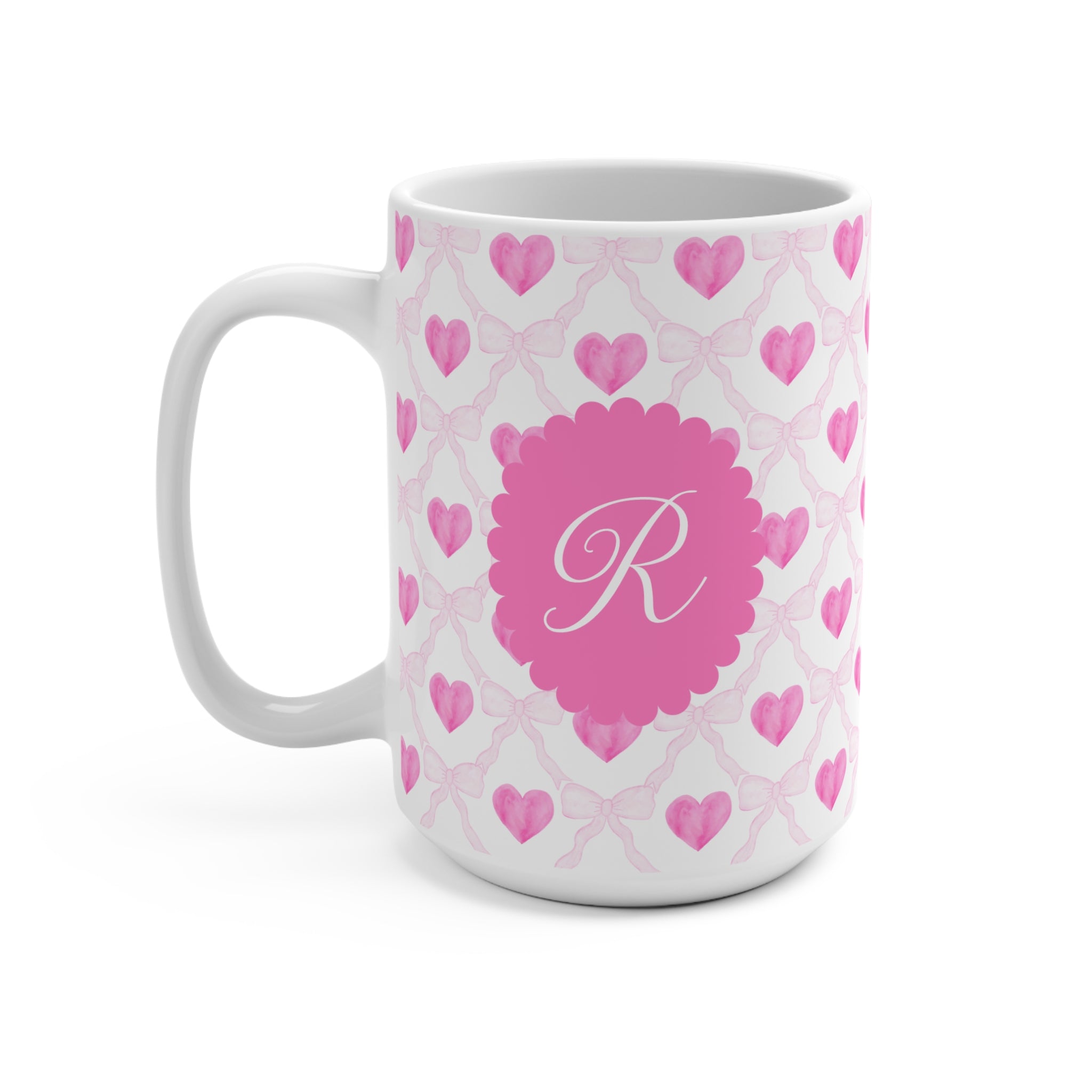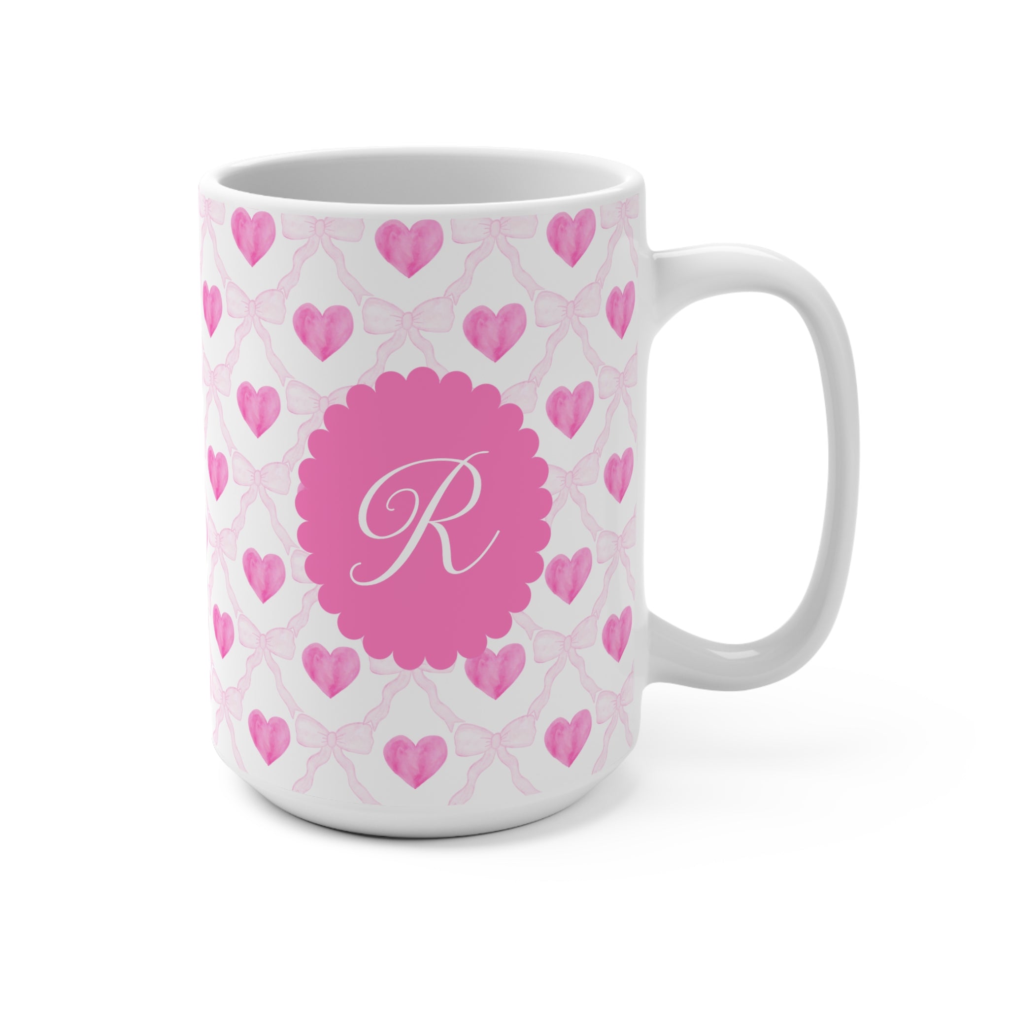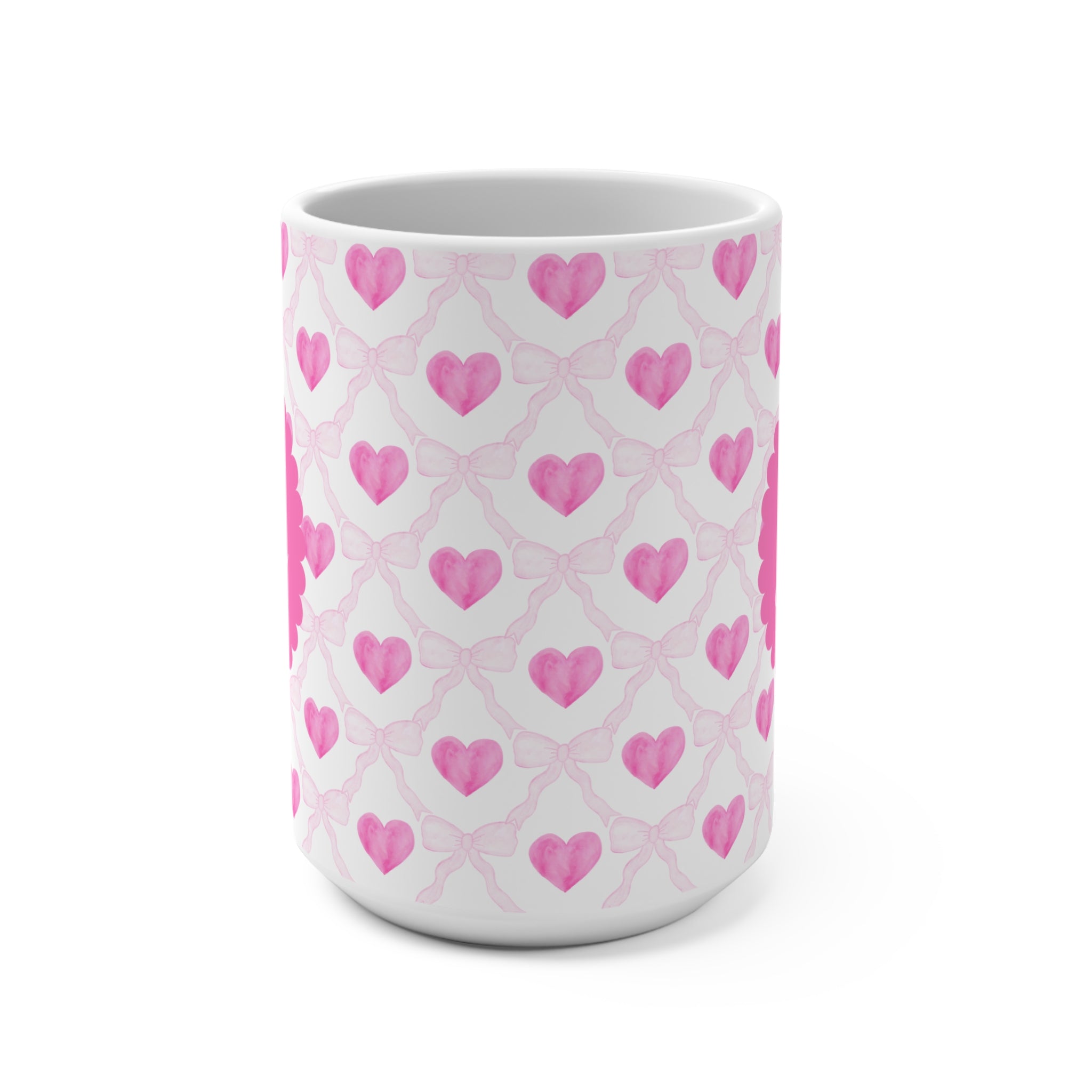 Personalized Pink Heart Monogram Mug — 15oz Ceramic Coffee Cup