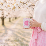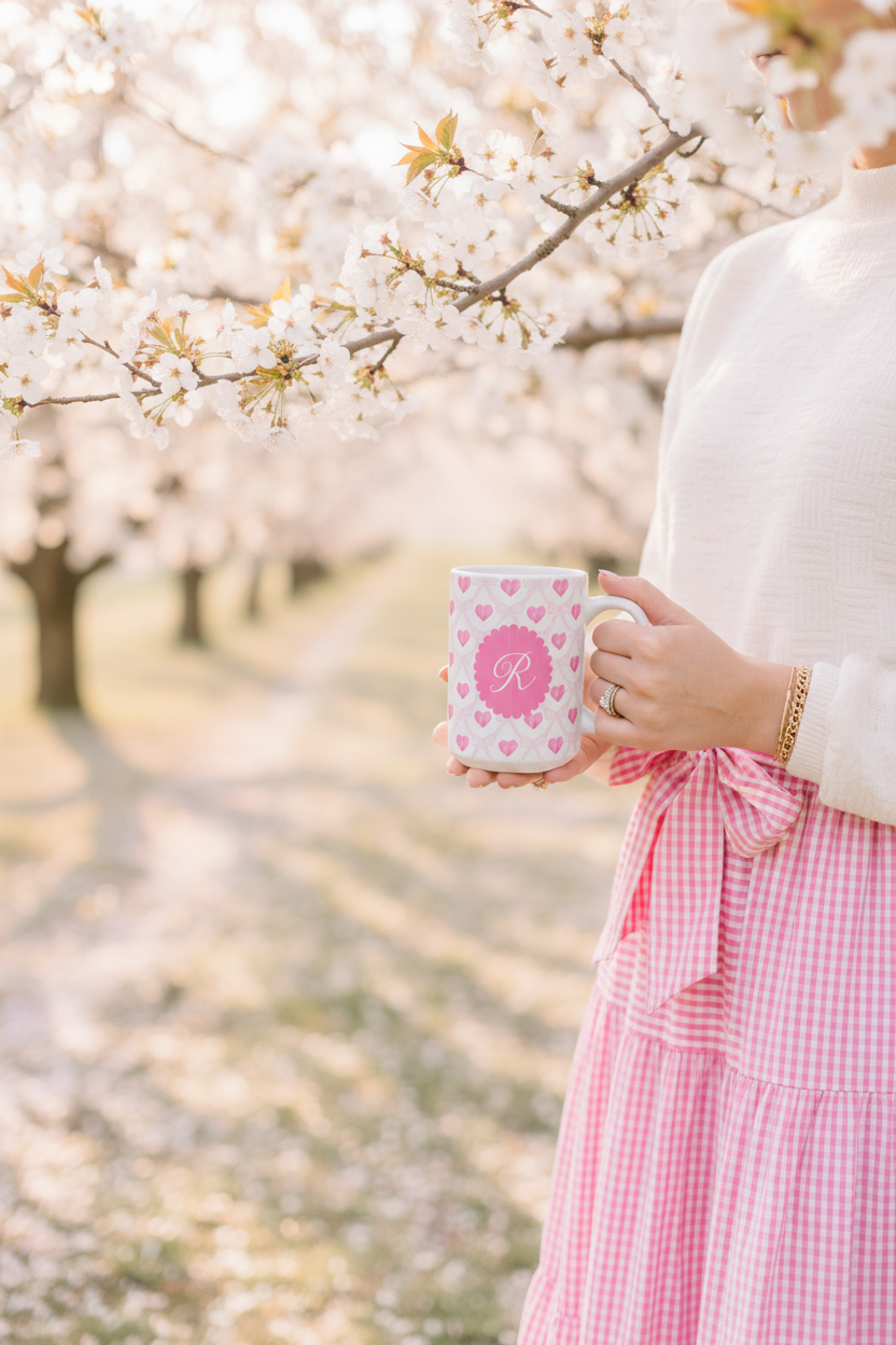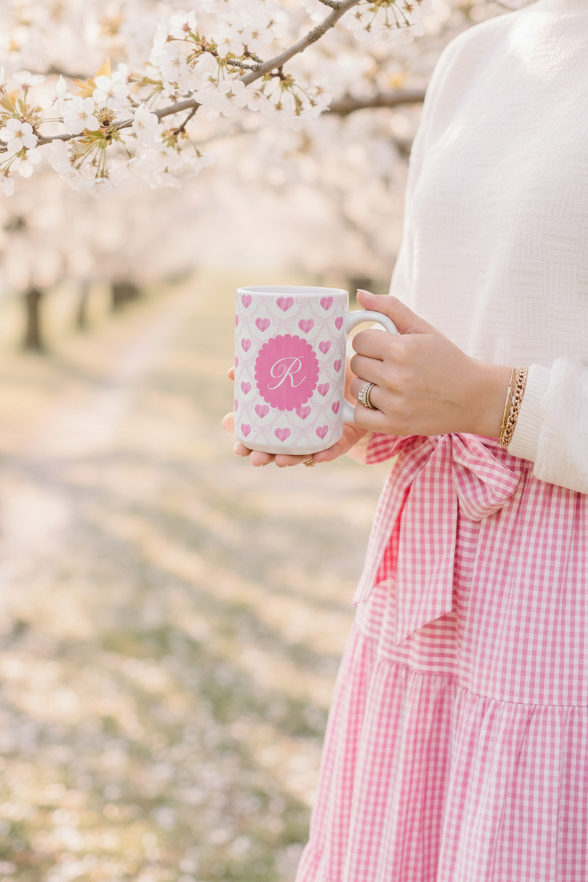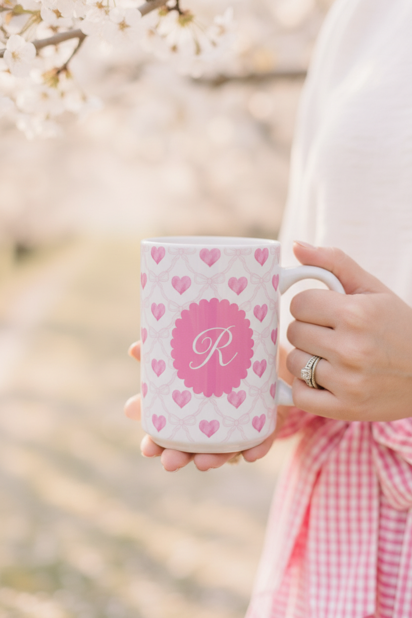 This 15oz ceramic mug brings a sweet, hand-painted charm to slow mornings and afternoon breaks. Soft watercolor hearts and delicate bows repeat around the surface, while a scalloped medallion holds a single initial for a personal touch. It feels like a cozy note left on the counter — warm, gentle, and a little romantic. Use it while journaling, sharing coffee with a friend, or settling in for a cozy reading hour; the pretty pink palette and monogrammed accent make ordinary moments feel considered and quiet.