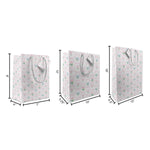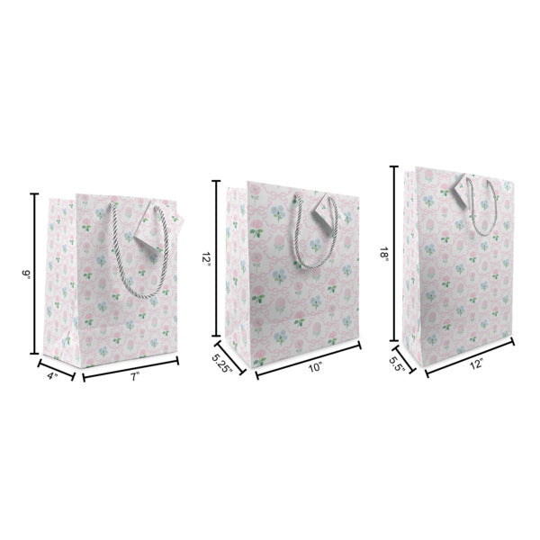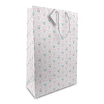 Each gift bag is printed in full color on premium, heavyweight paper, then carefully cut, scored, and folded for a polished finish. Elegant silver rope handles are securely attached, along with a coordinating gift card for easy personalization. A sturdy cardstock base reinforces the bottom of the bag, allowing it to hold gifts beautifully and confidently.