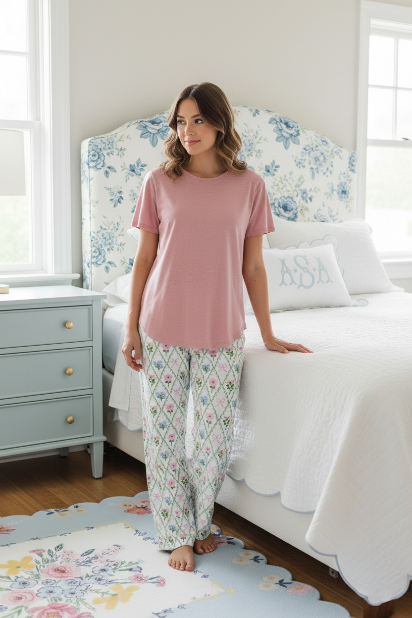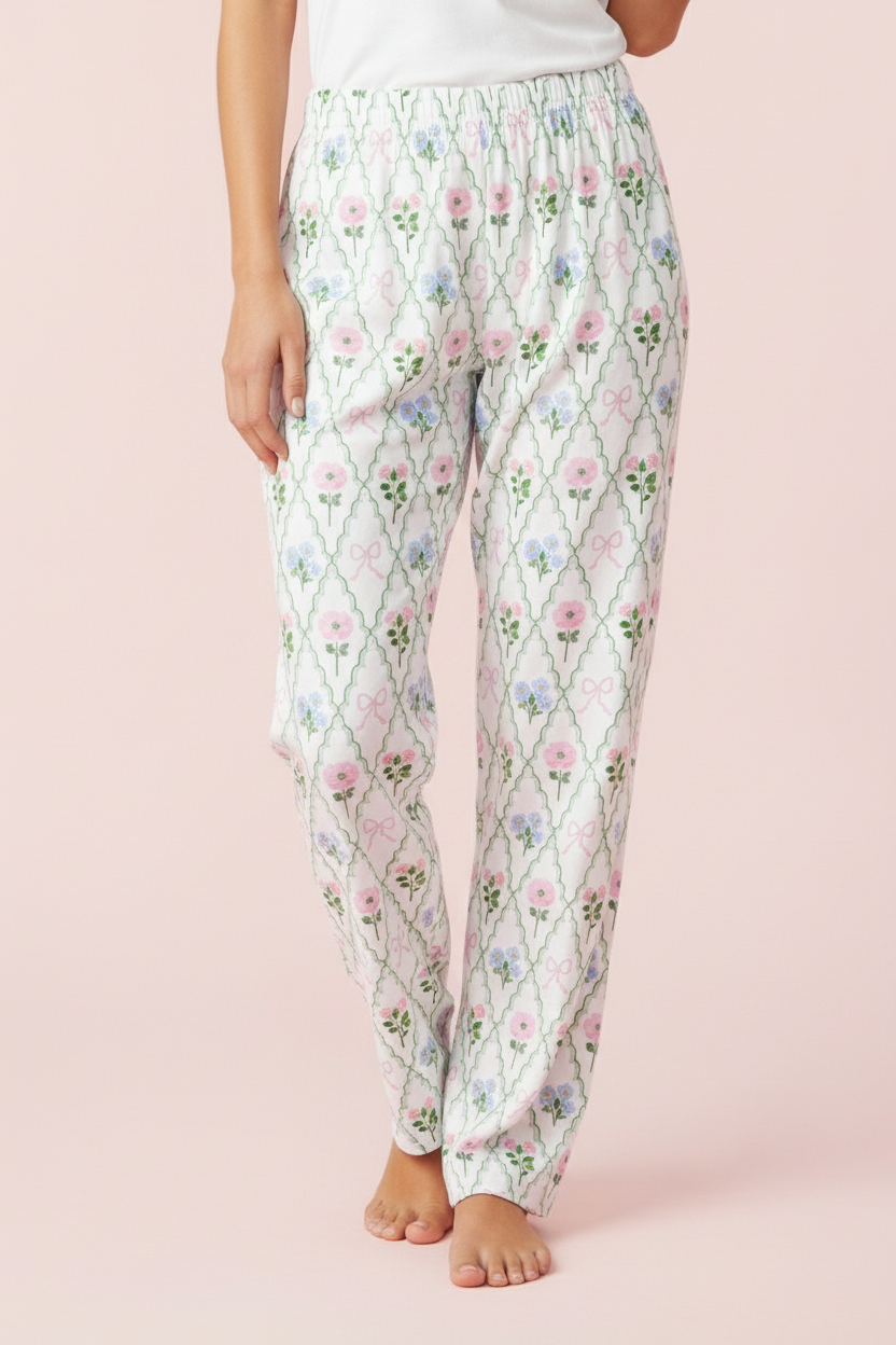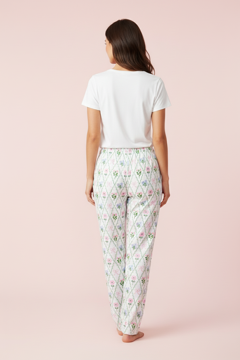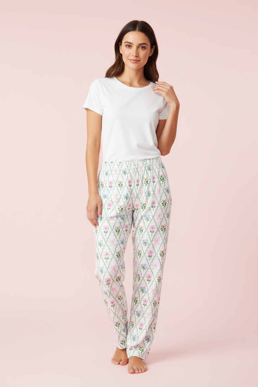 Light as a sigh and soft against your skin — these pajama pants bring a quiet, vintage charm to slow mornings and late-night reading. A delicate diamond grid holds tiny rose and leaf motifs in pastel pinks, greens, and blues, like a pressed-flower pattern passed down through seasons. The brushed polyester drapes gently, moves with you, and keeps the print crisp wash after wash. Wear them while brewing tea at dawn, curled up with a chapter by the window, or stretching into a lazy evening routine — they carry a gentle, homey mood without fuss. The elastic waistband and smooth interior label mean comfort comes first, so the pattern can be the part you notice most.