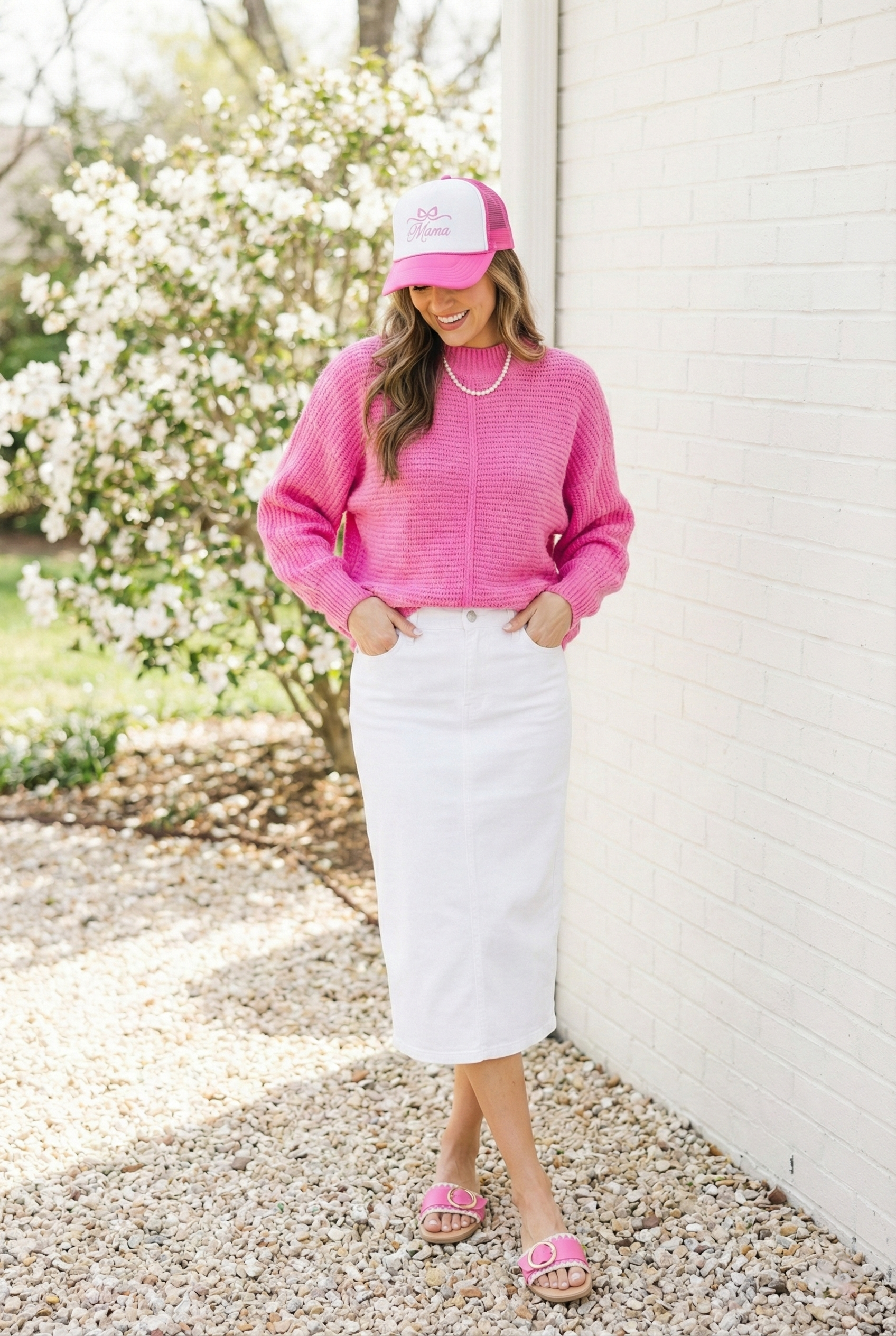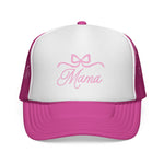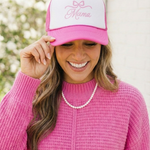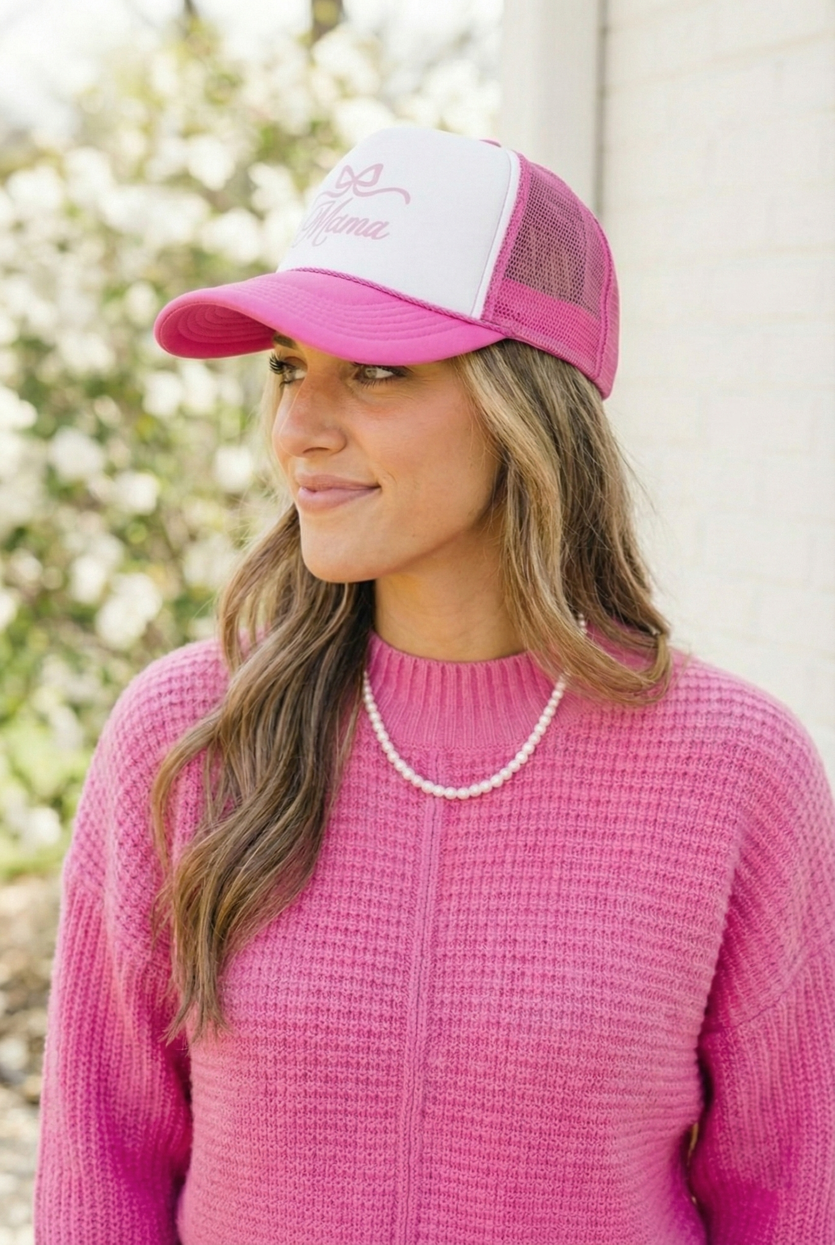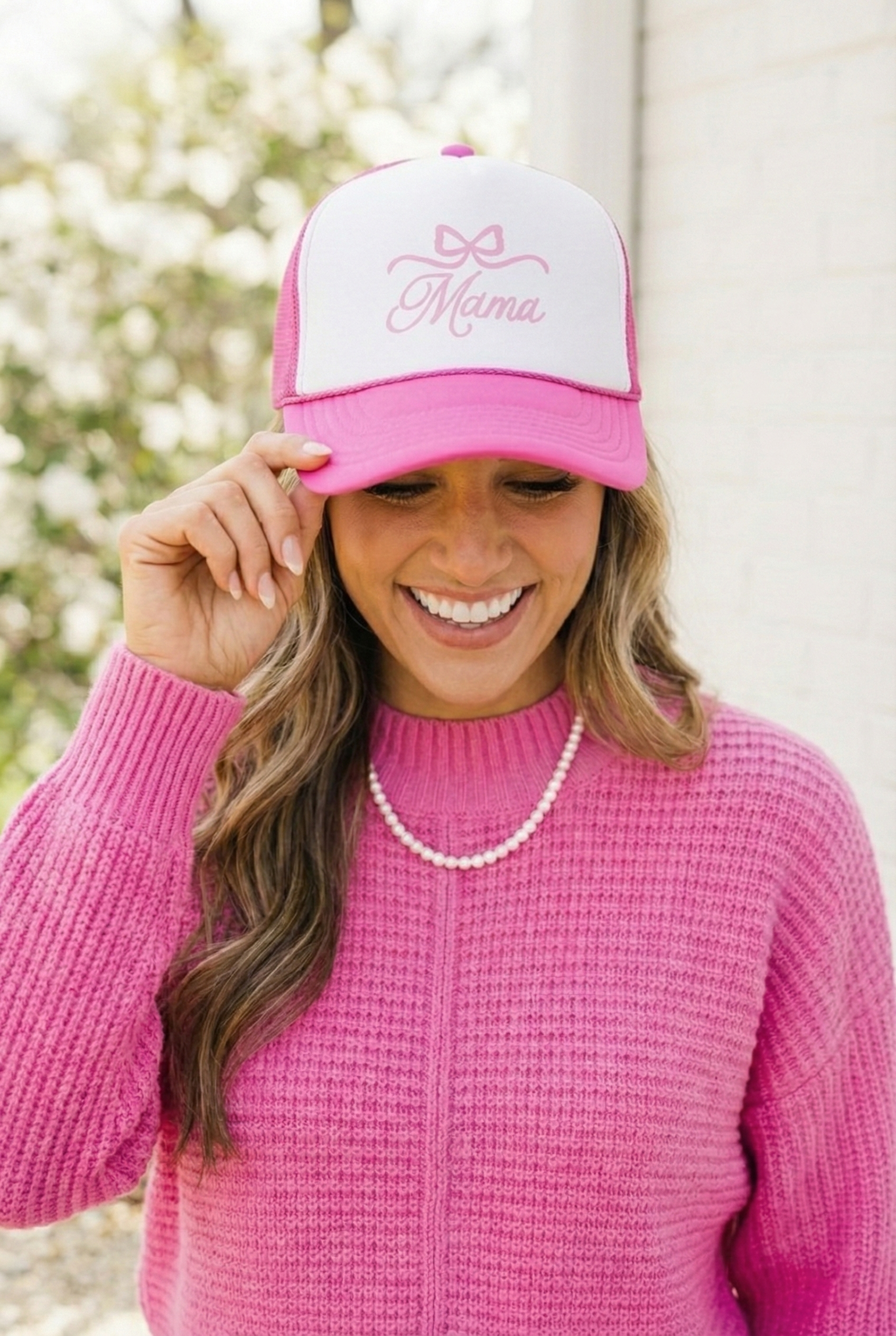 Mama Trucker Hat — Pink Script Bow Cap for Moms