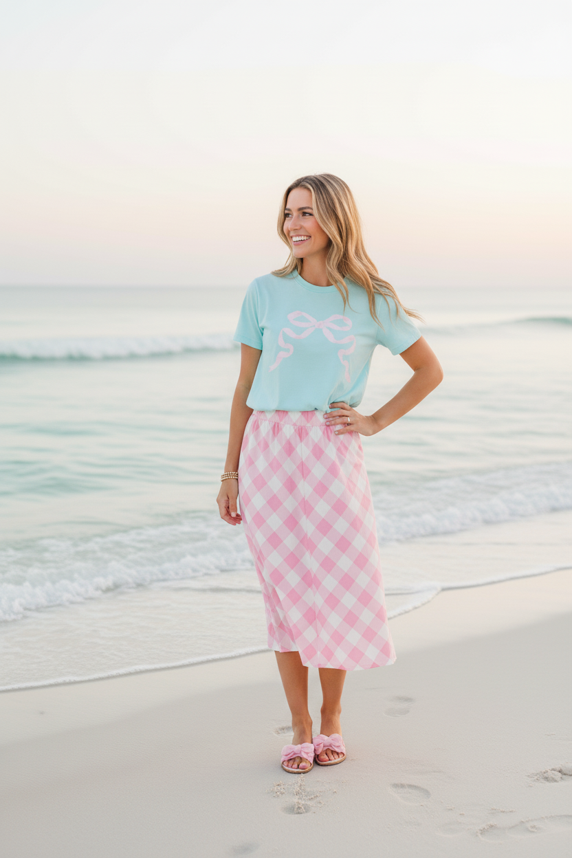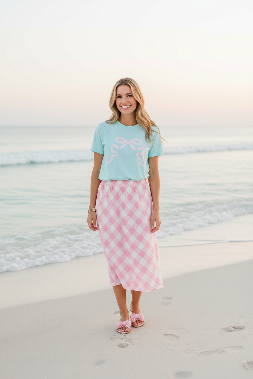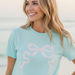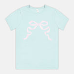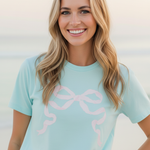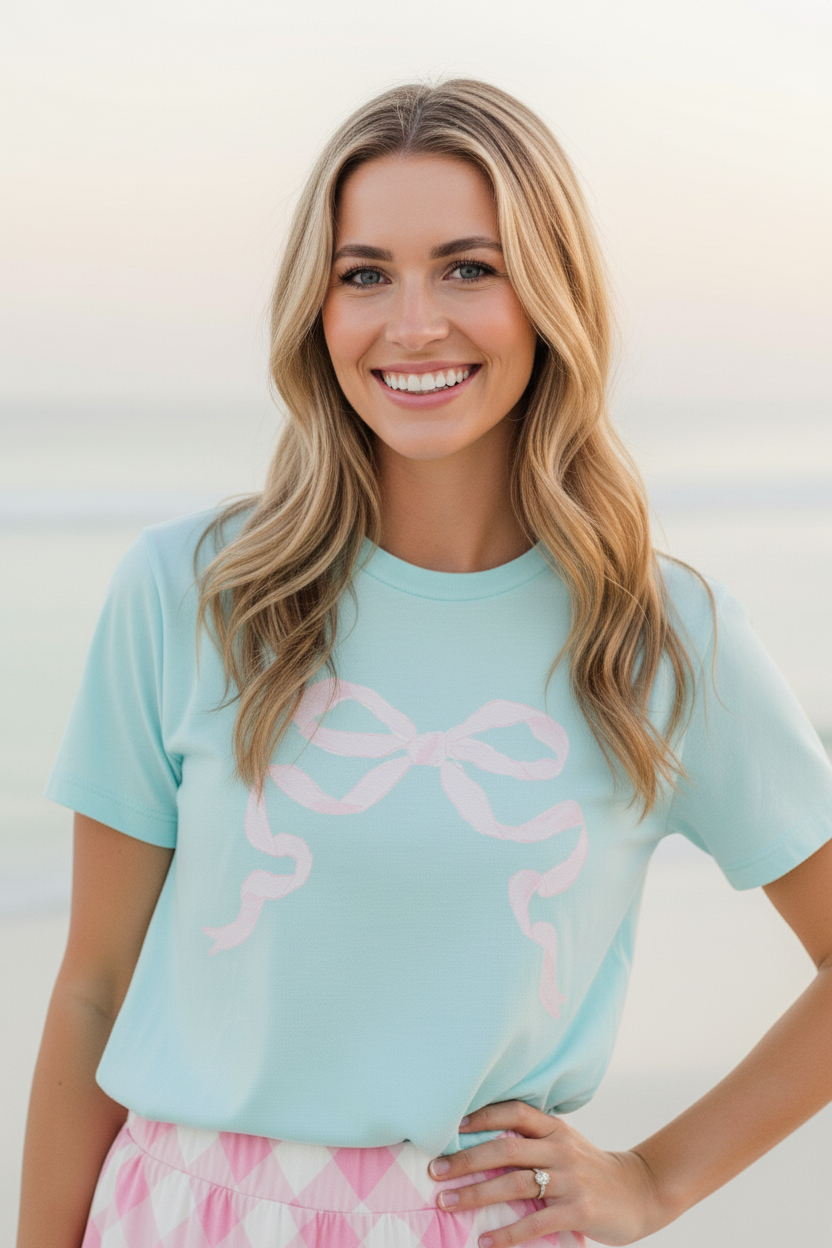 Bring a touch of pastel sweetness to your everyday style with the Preppy Bow Tee. Inspired by the soft, airy tones of summertime treats, this tee features a charming bow motif that adds the perfect pop of feminine whimsy. The gentle minty-aqua backdrop paired with the blush bow detail creates a look that feels light, cheerful, and effortlessly polished.