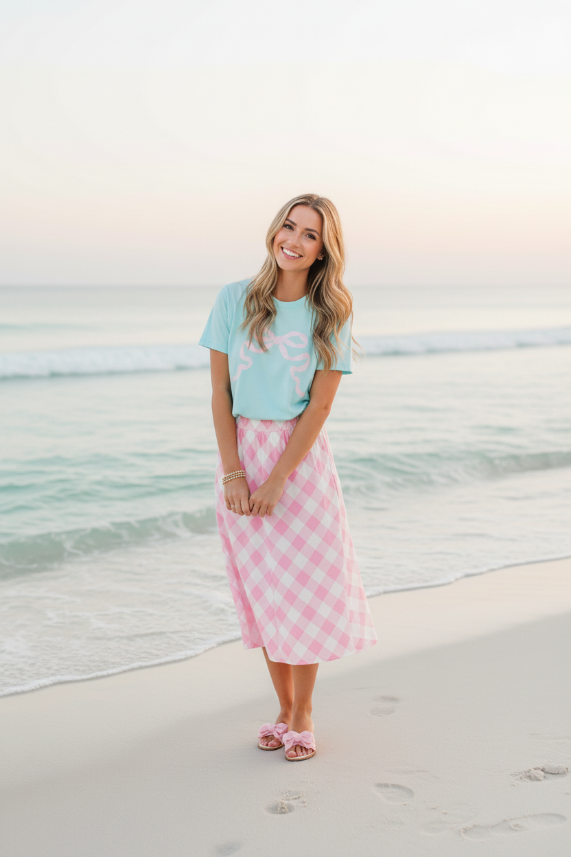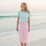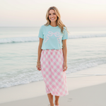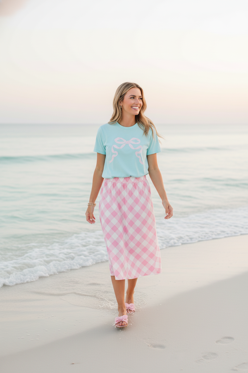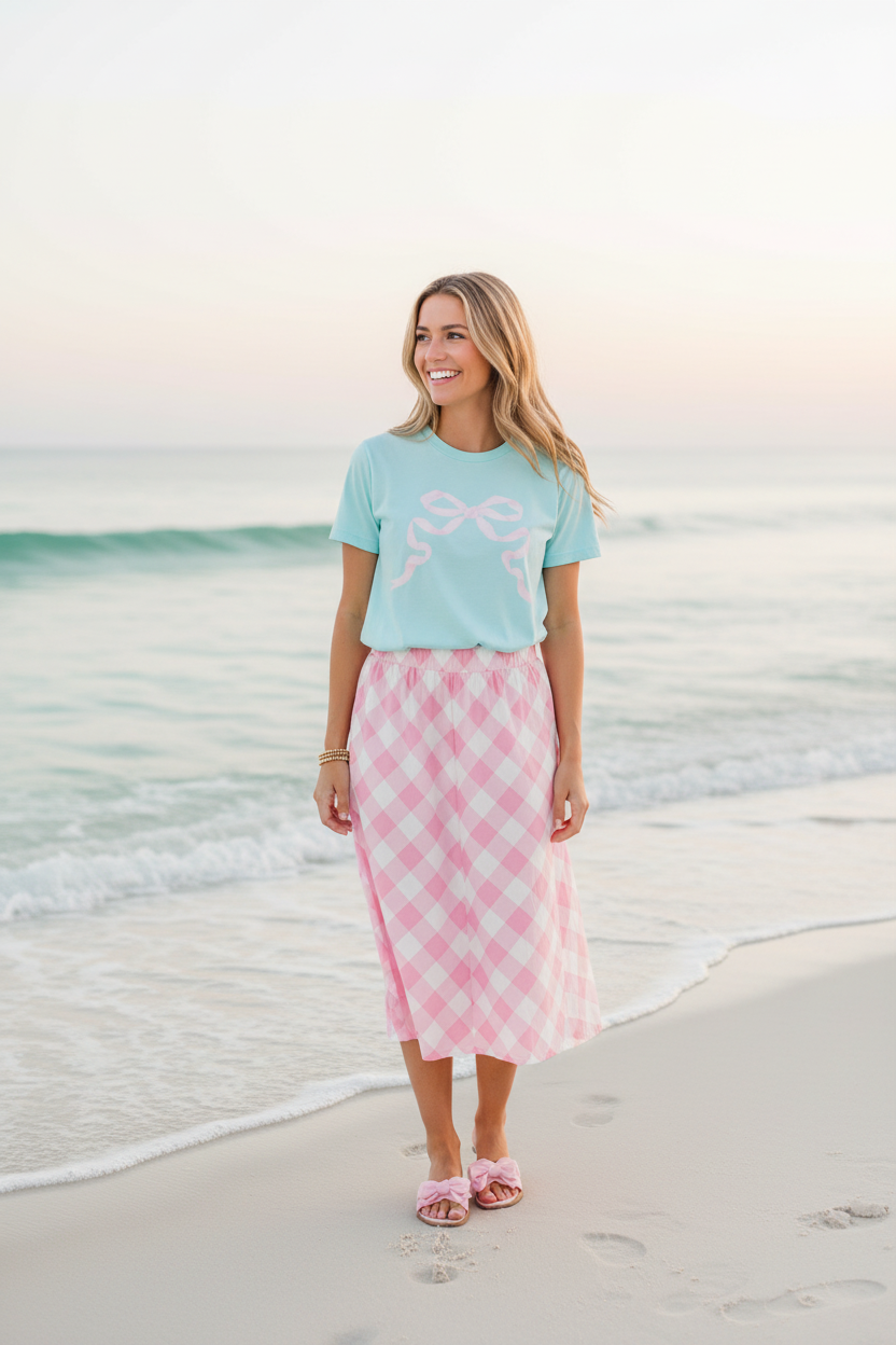 Bring a touch of pastel sweetness to your everyday style with the Preppy Bow Tee. Inspired by the soft, airy tones of summertime treats, this tee features a charming bow motif that adds the perfect pop of feminine whimsy. The gentle minty-aqua backdrop paired with the blush bow detail creates a look that feels light, cheerful, and effortlessly polished.