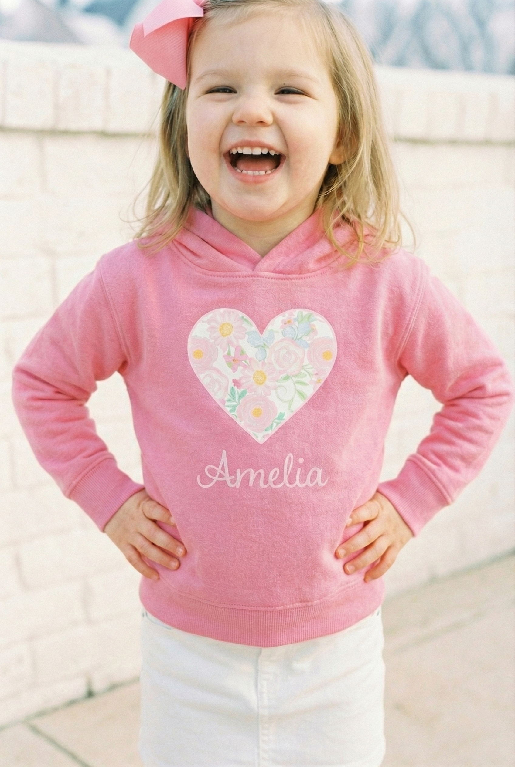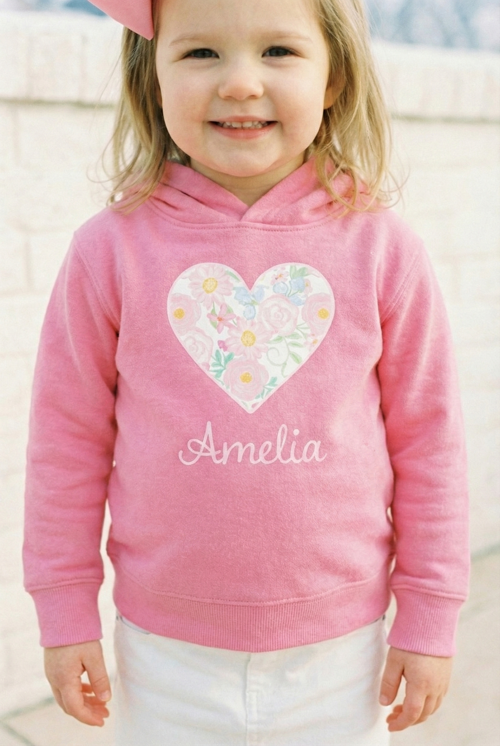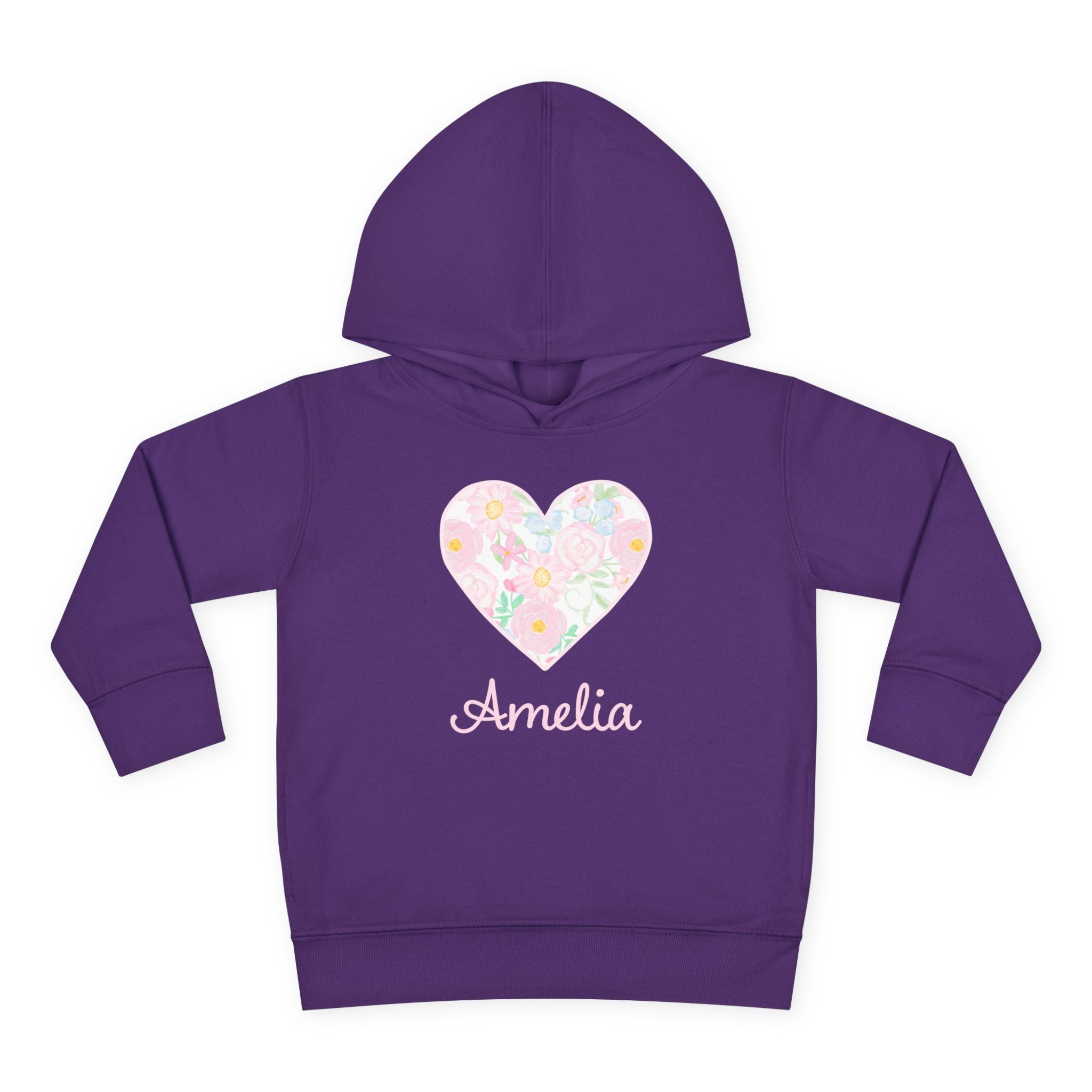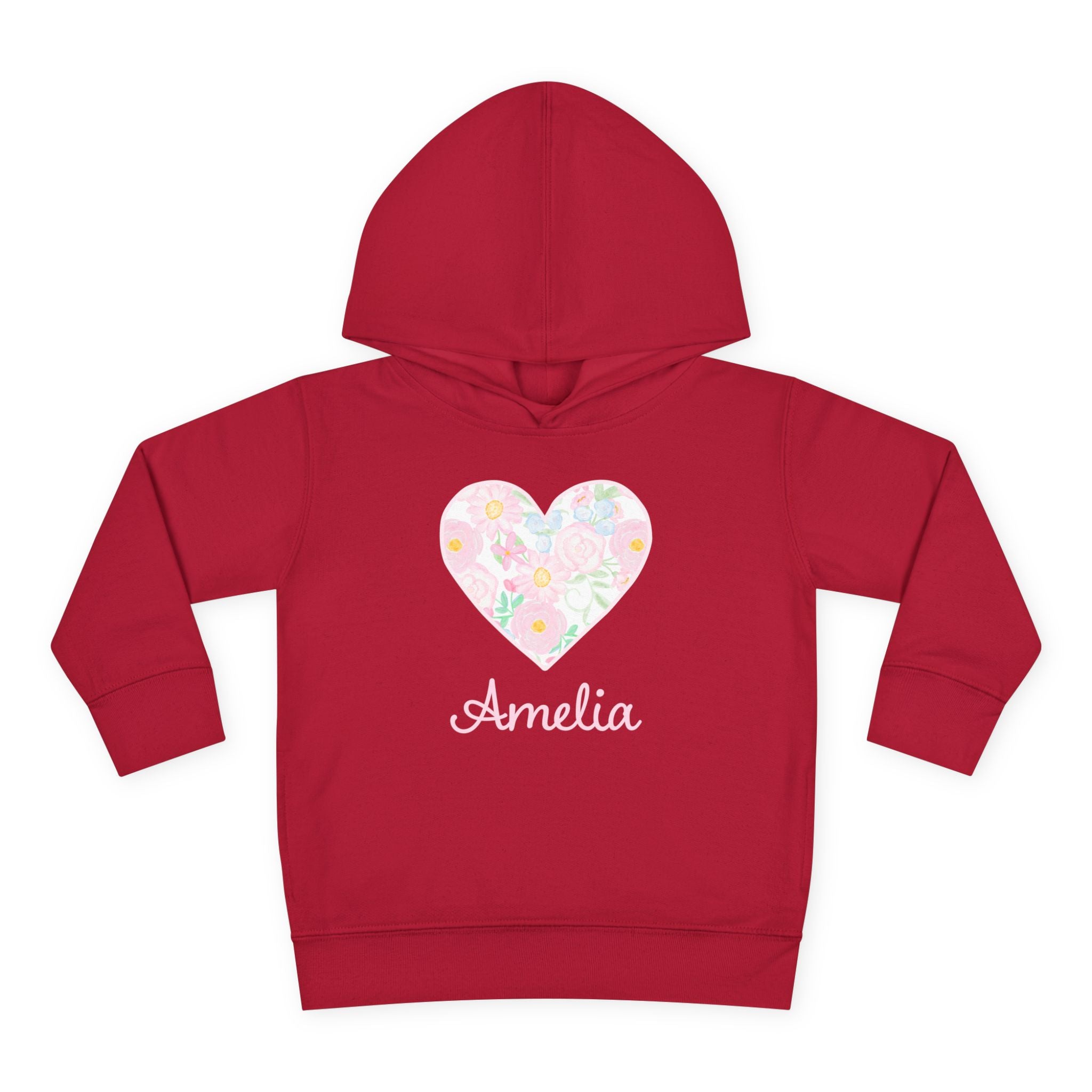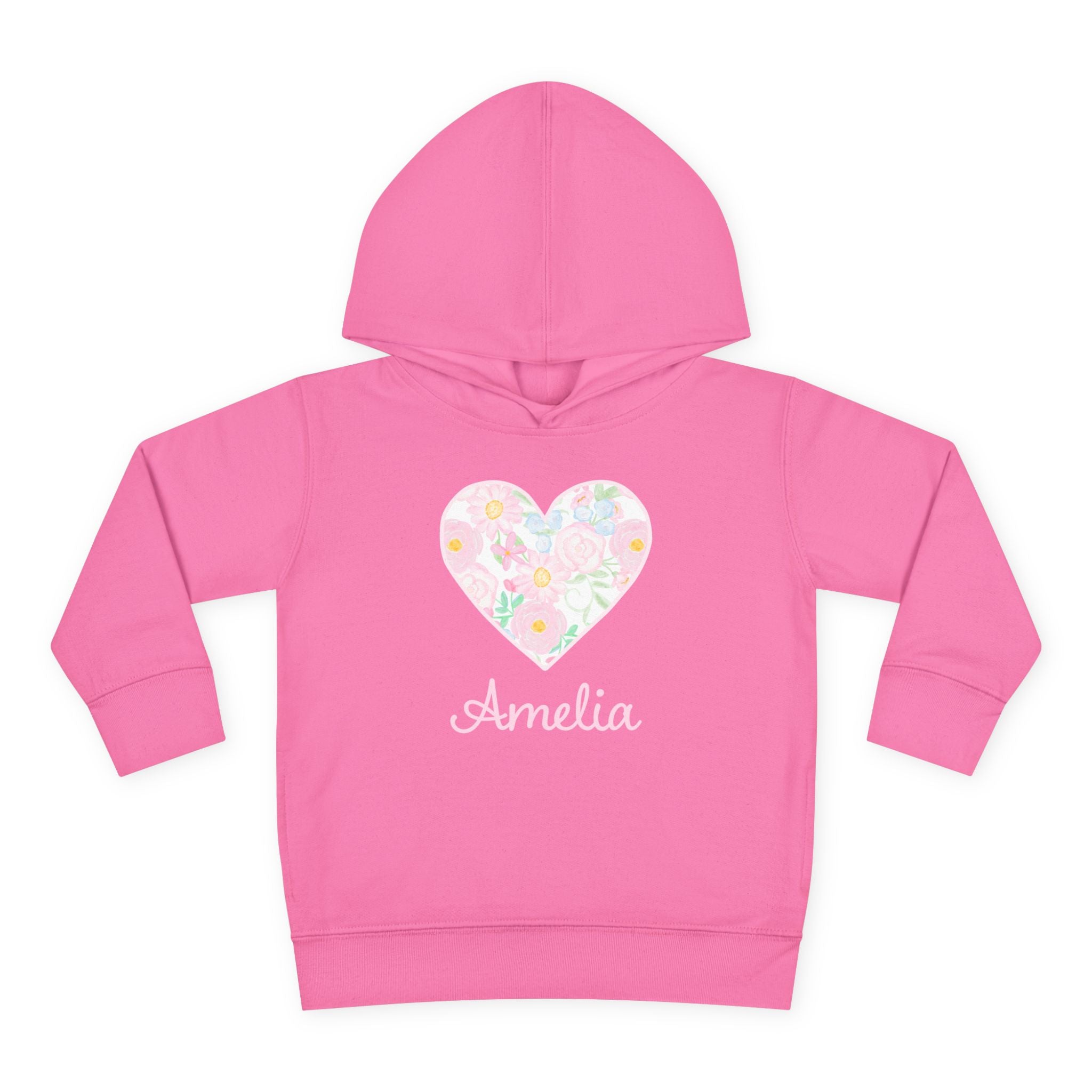 Soft, cuddly, and sweet — this toddler hoodie wraps little ones in gentle warmth and simple charm. A pastel floral heart rests on the chest with a delicate name script beneath, bringing a quiet, personal touch to everyday play. The medium-weight fleece holds its shape through hops, claps, and naptime, while roomy side pockets and a lined hood offer cozy practicality. It’s the kind of hoodie parents reach for on crisp mornings, park adventures, or storytime on the couch — familiar, comforting, and softly styled to match tiny personalities.