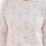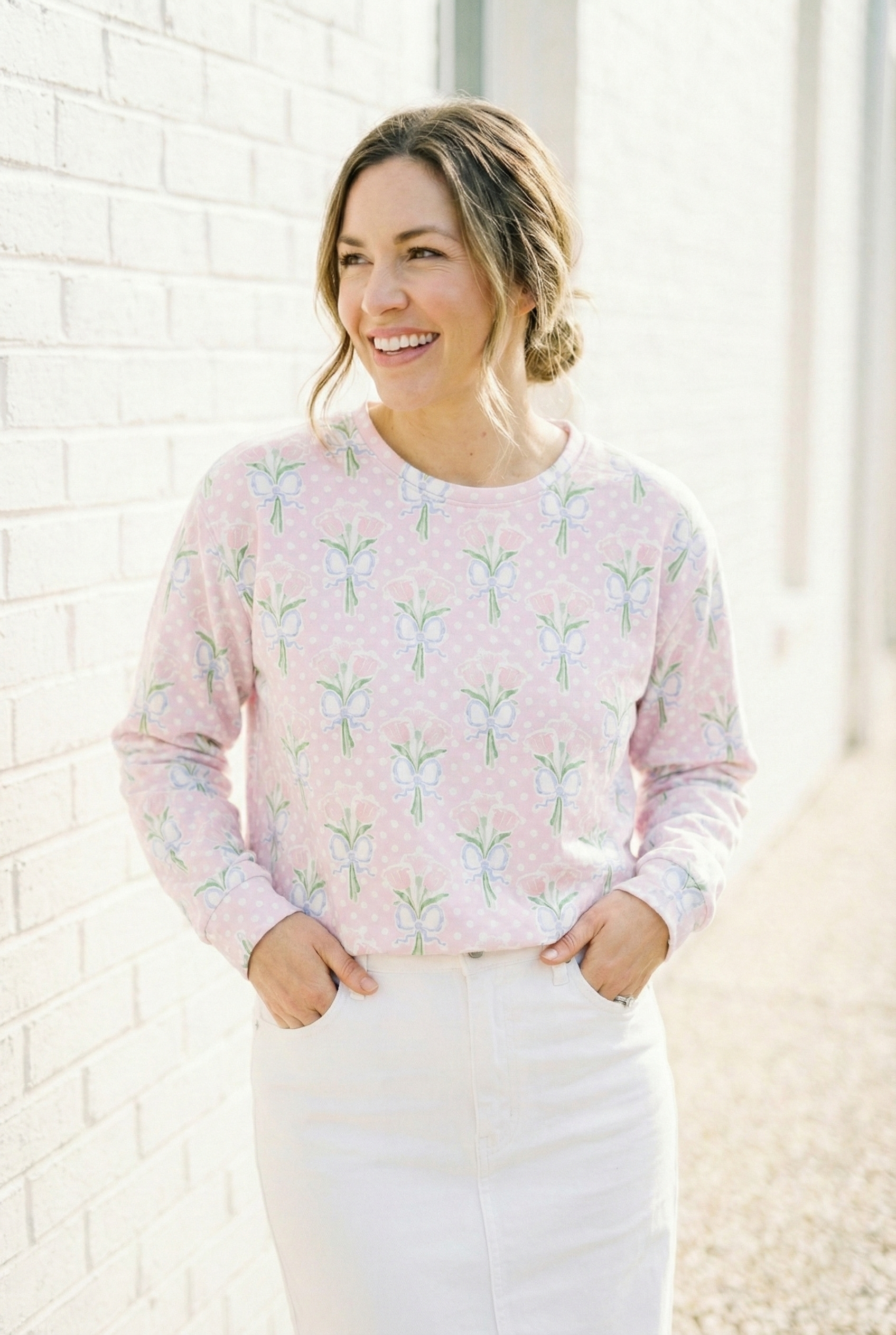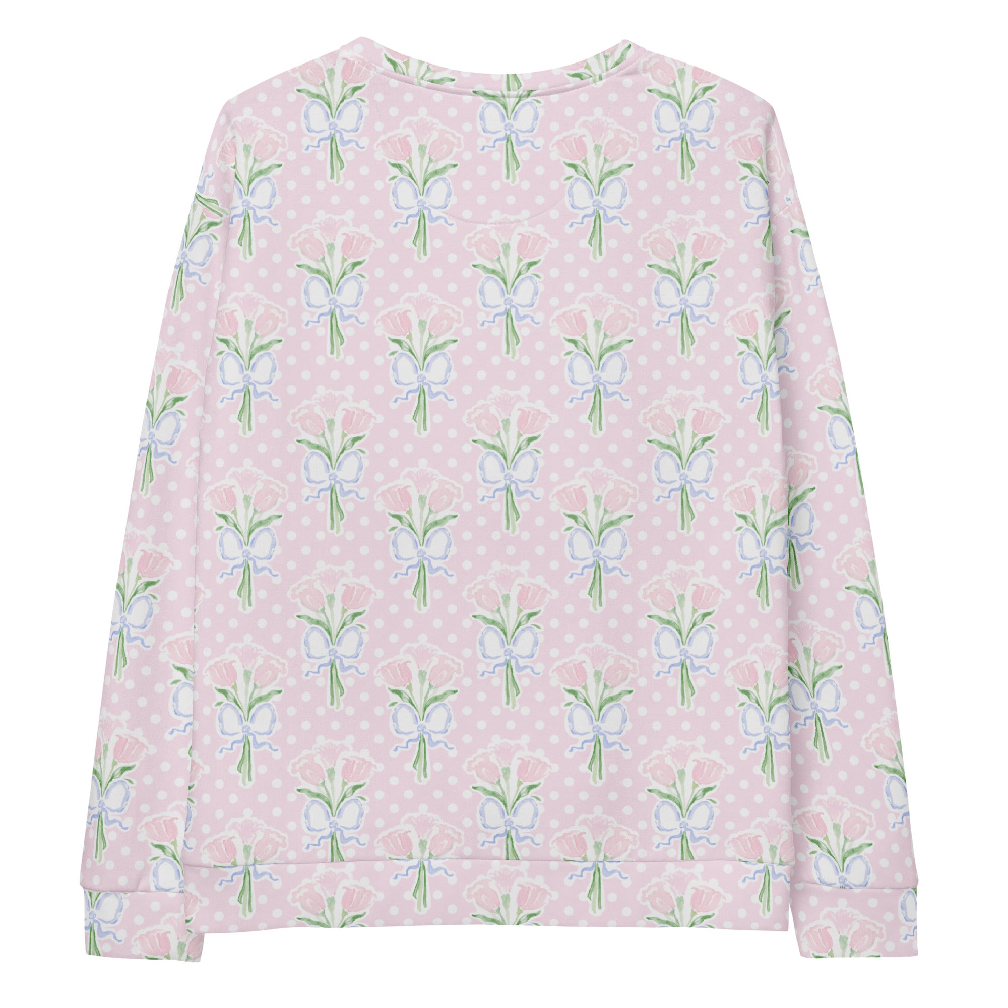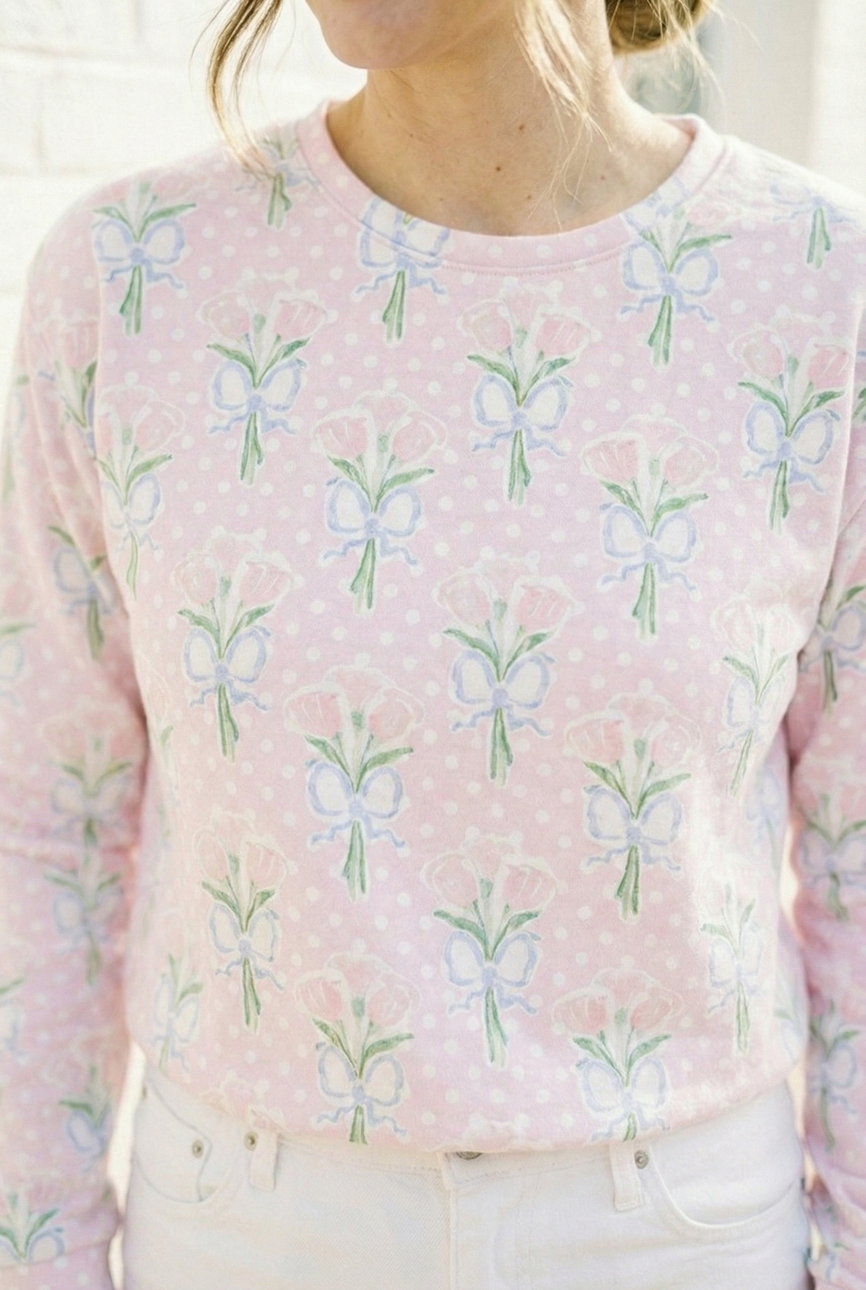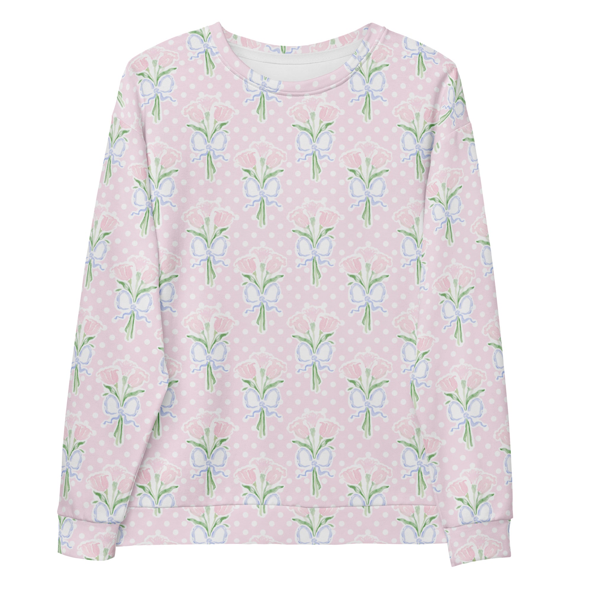 This all-over printed sweatshirt is carefully precision-cut and hand-sewn to showcase the gentle beauty of the pattern hand painted in house by Katie. Soft blush tones, delicate florals, and bow-tied details come together in a design that feels timeless and tender—perfect for everyday wear that still feels special.