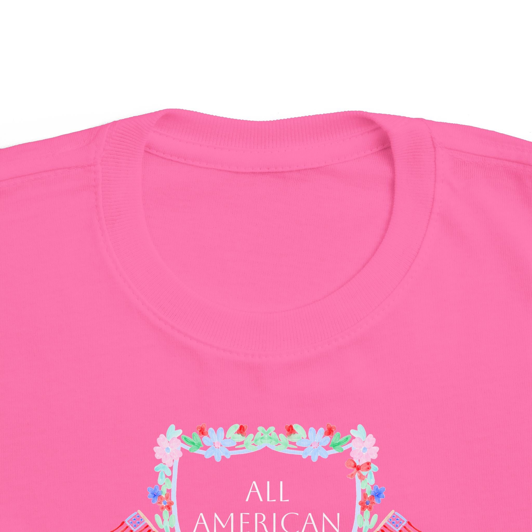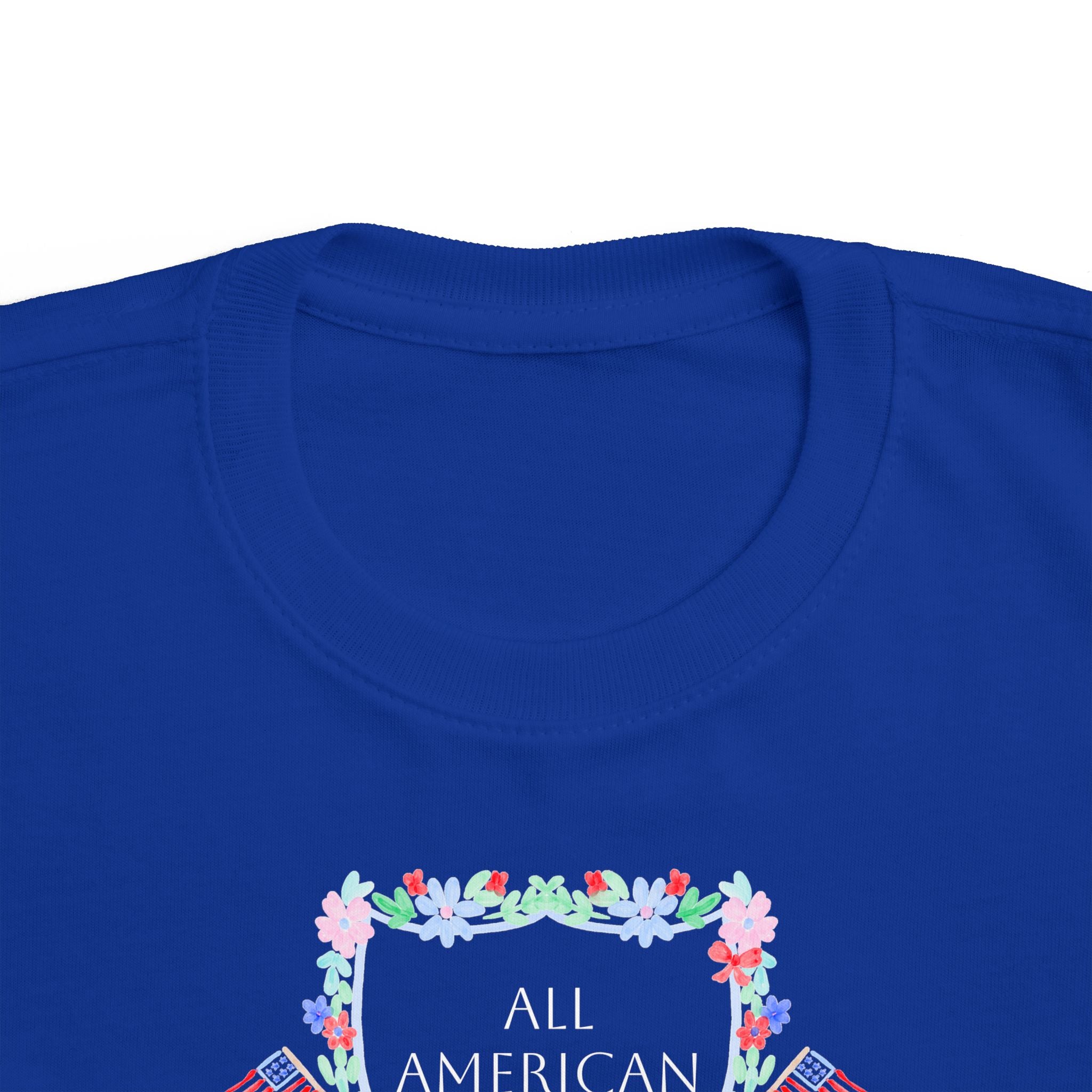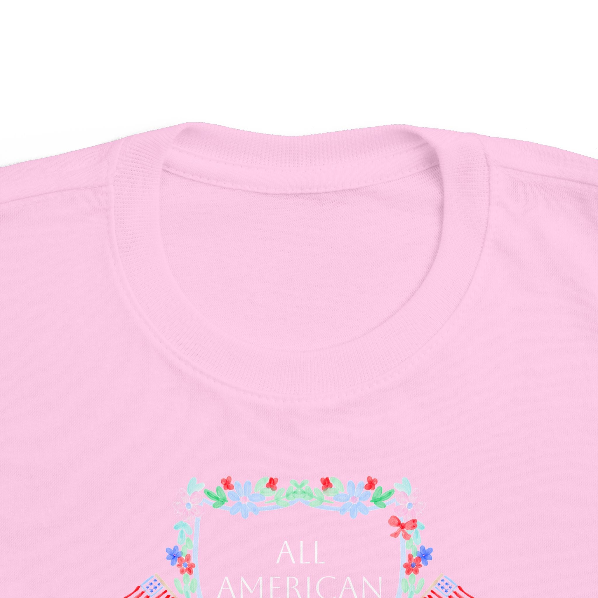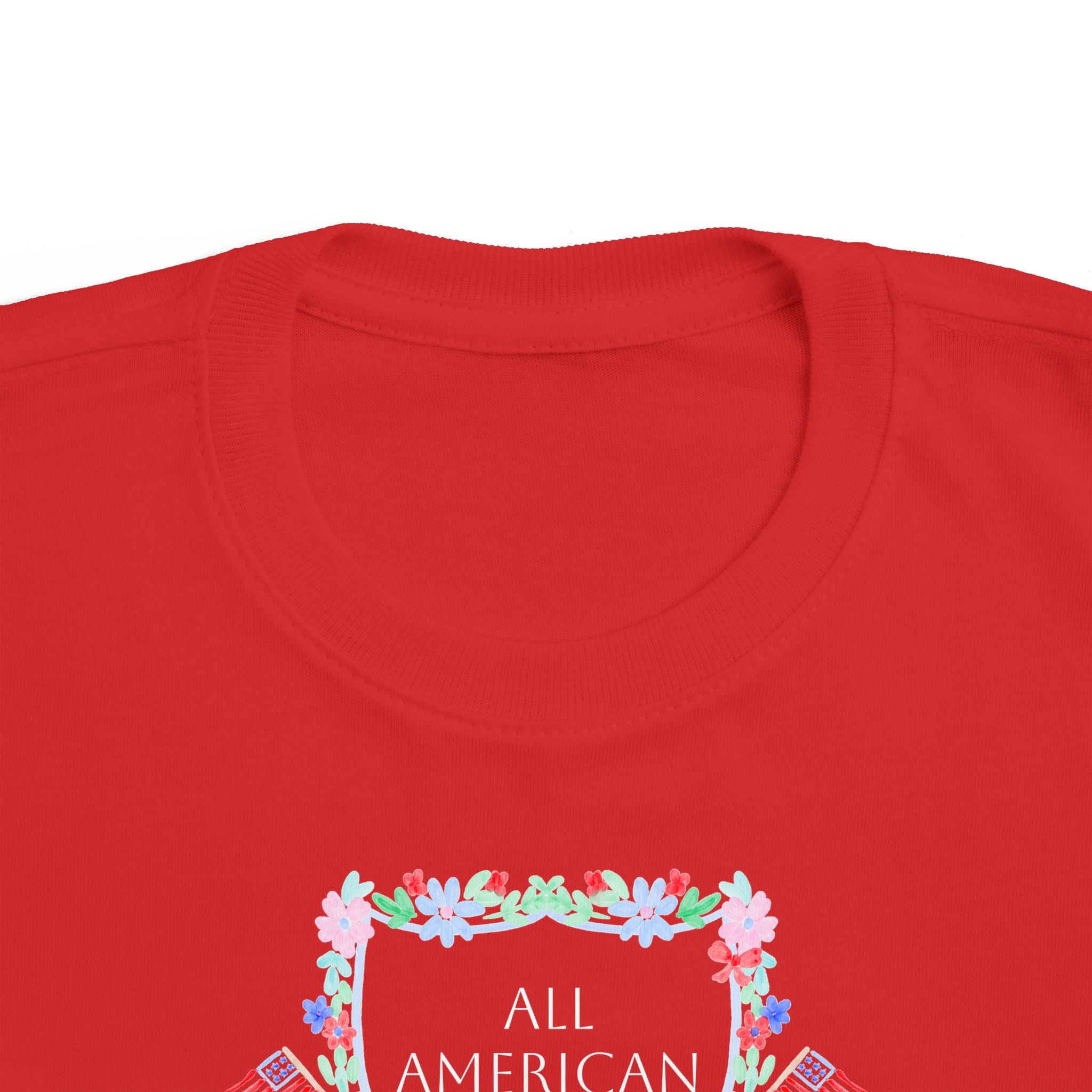 A delicate pastel wreath frames tiny flags and florals, spelling out “All American Cutie” for a charming, festive touch. The classic cut allows for carefree movement, while the ribbed knit collar and reinforced shoulder seams help the tee hold its shape through every wash, splash, and sparkler moment. A tear-away label keeps irritation away, making this tee a favorite for sensitive skin.