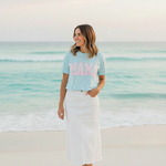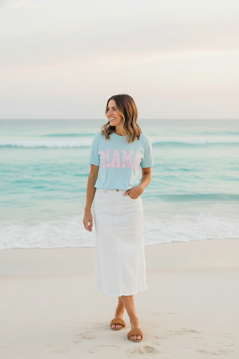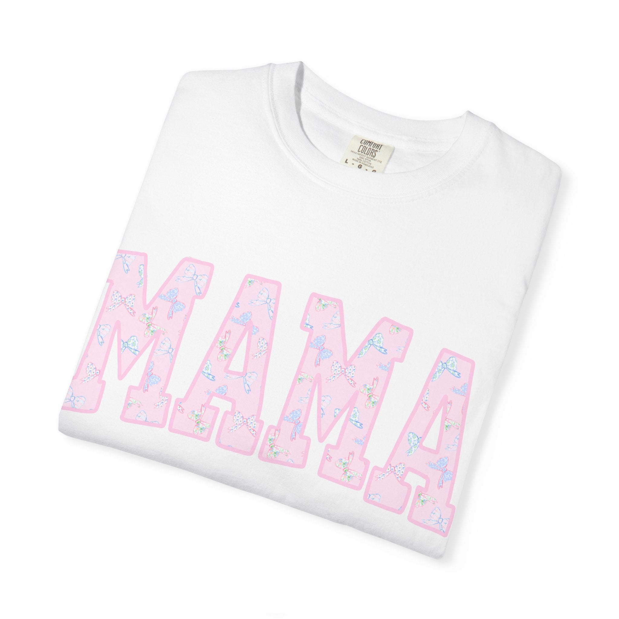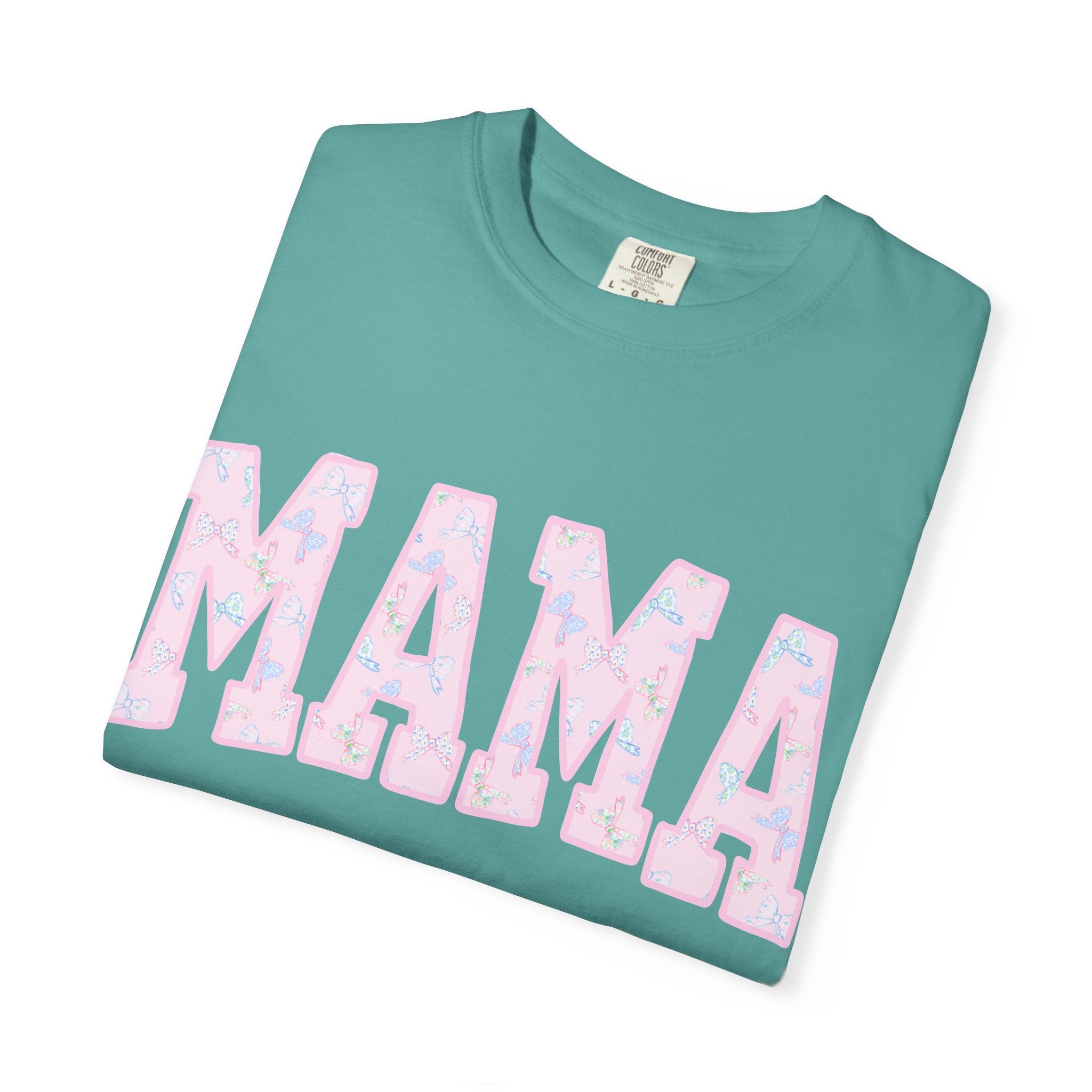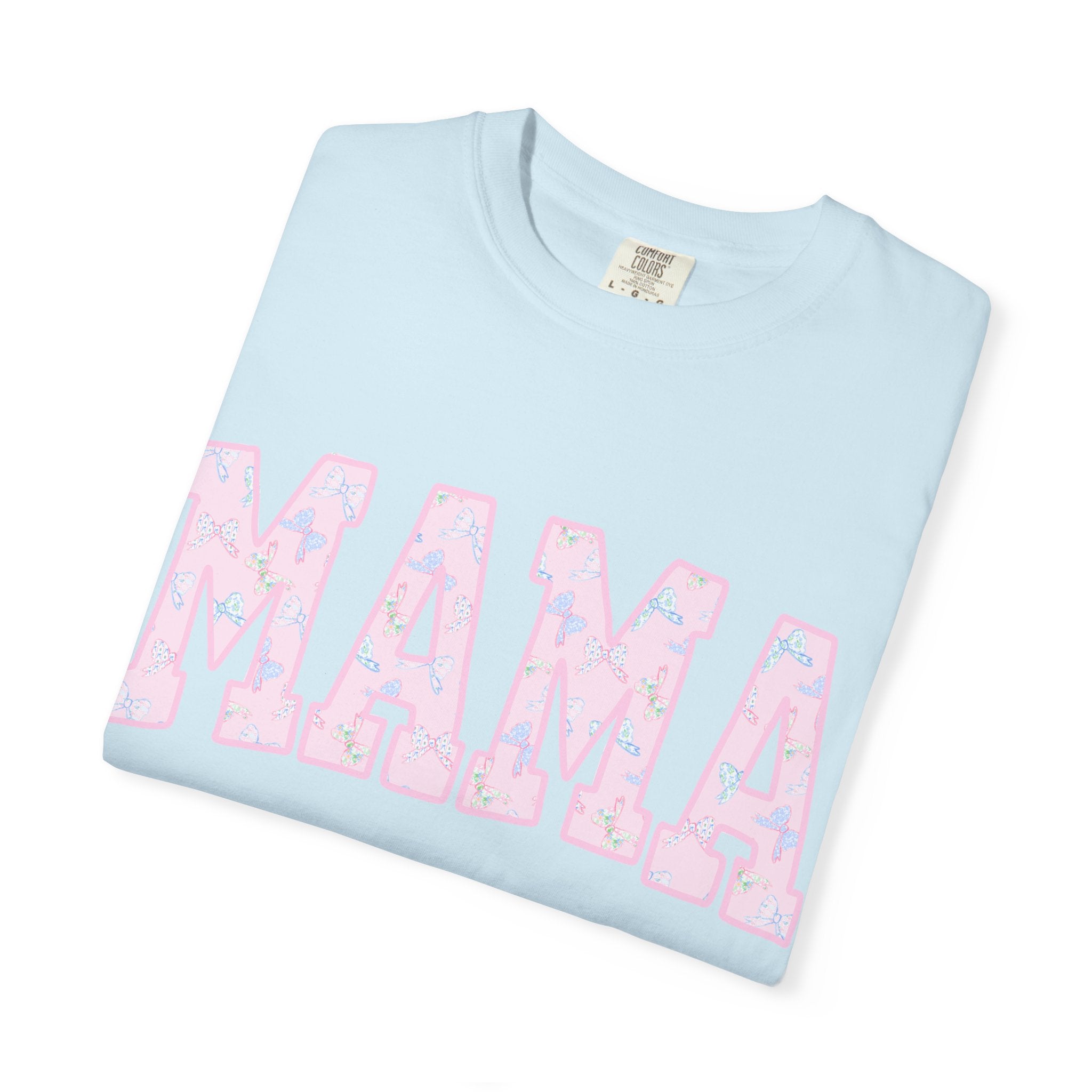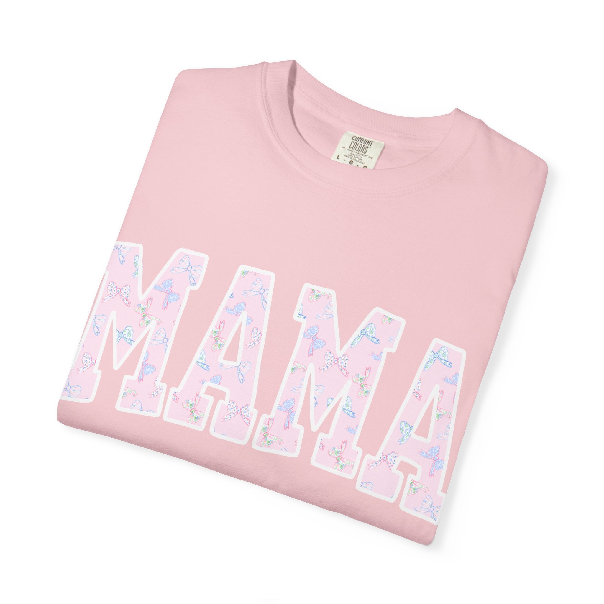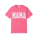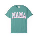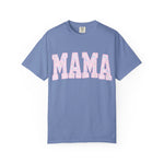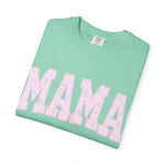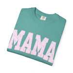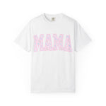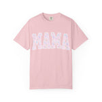 Soft, lived-in comfort meets quiet, modern motherhood. This garment-dyed tee carries a relaxed silhouette and a gentle washed texture that settles into everyday life — school runs, coffee refills, bedtime stories. The front features a bold, collegiate-style "MAMA" graphic softened with a pastel floral fill, giving it a nostalgic-yet-feminine feel that reads casual and affectionate. Breathable heavyweight cotton holds shape while the garment-dye adds subtle color variation, so the shirt looks like an old favorite from day one. Wear it with denim and sneakers for errands, layered under a cardigan on cooler mornings, or tossed on after yoga for slow, easy afternoons.